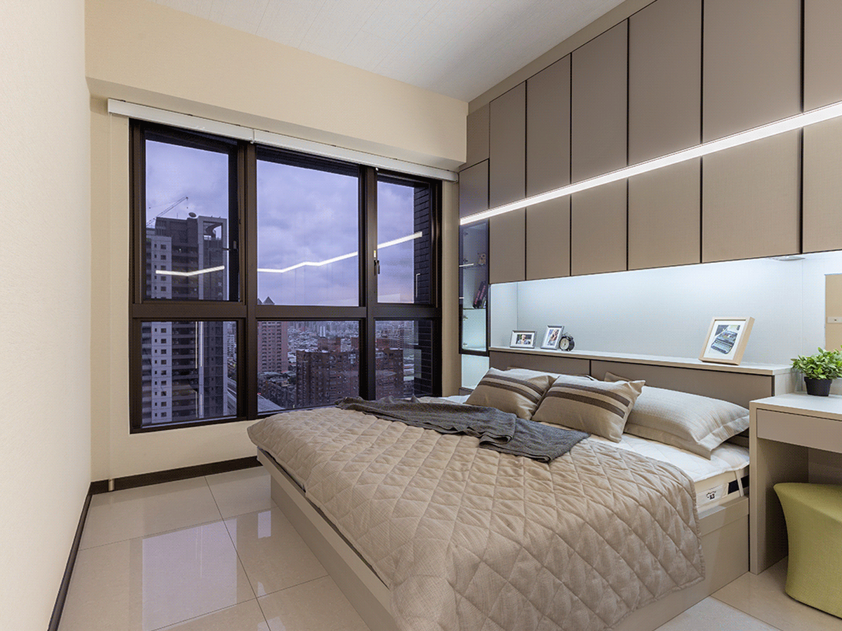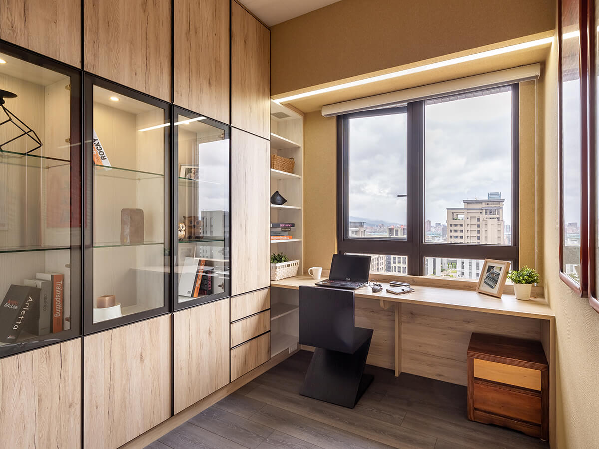 走進書房,整面收納牆中間以鋁框玻璃門為展示櫃,在工整的線條中多了人文氣息,書桌與櫃體緊密結合,配合地板的深淺帶出層次,充分在極簡的設計裡展現豐富的變化、呈現出對於極簡的追求。