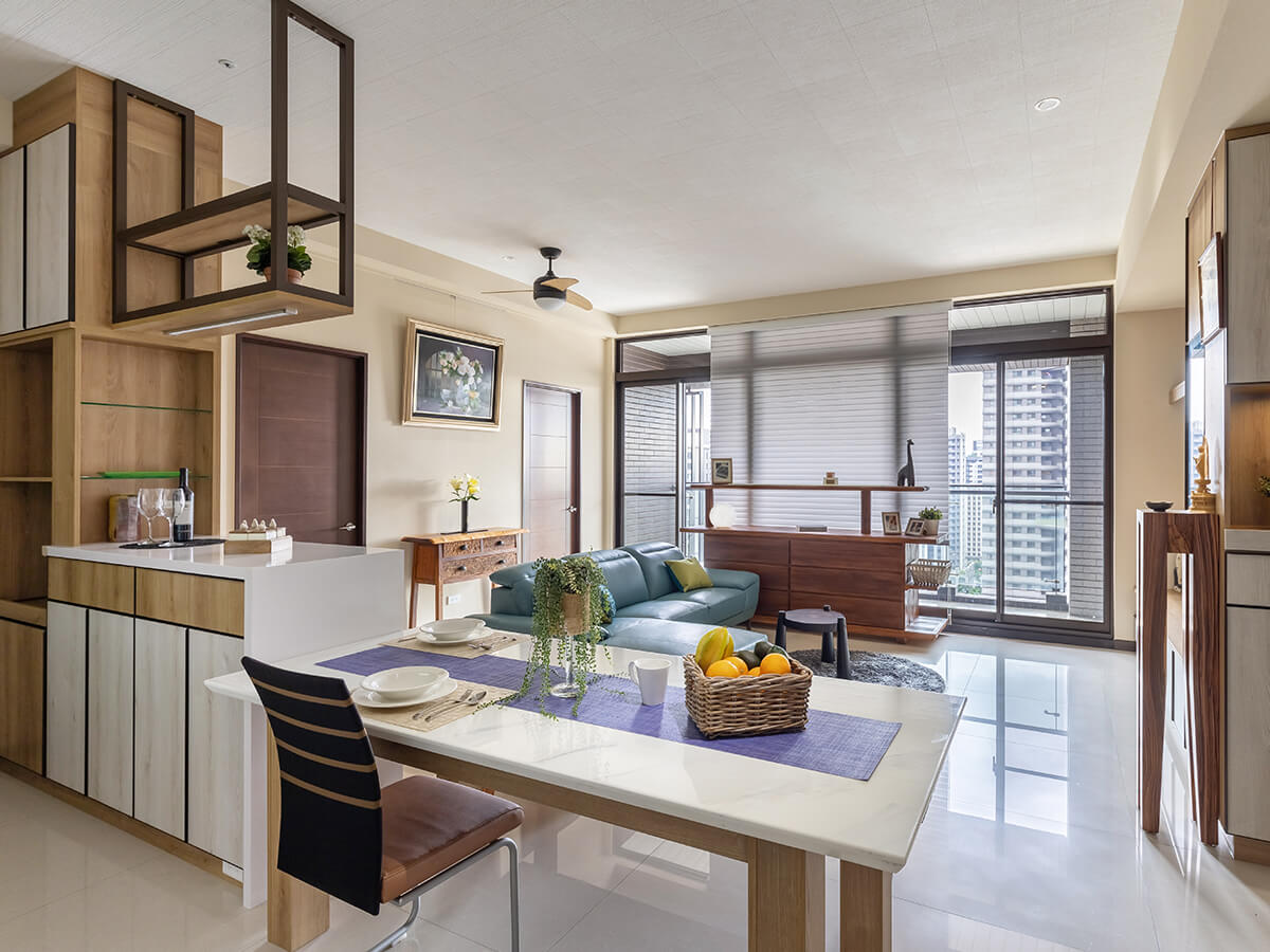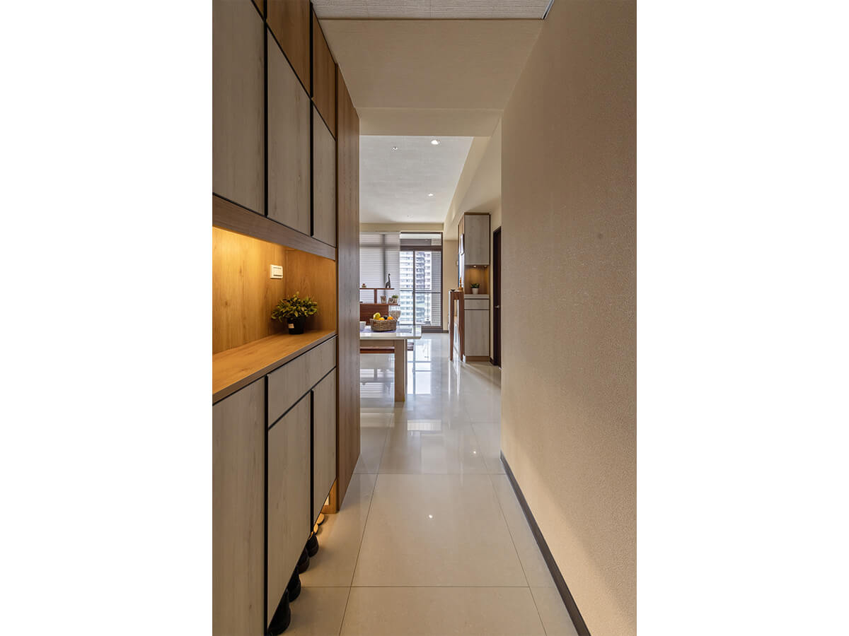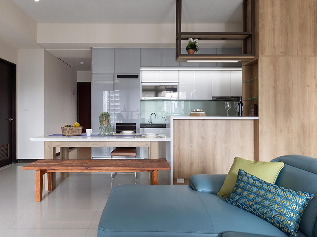 首先映入眼簾的是木質色調的玄關櫃,對應屋主喜愛的原木製品,有著安定心神的禪意;進入廳堂、餐桌旁的中島餐櫃仍舊以木質門片呼應主題,另一側做為吧檯使用、與天花板吊掛下來的吊櫃,交織出自得而閒適的生活品味。