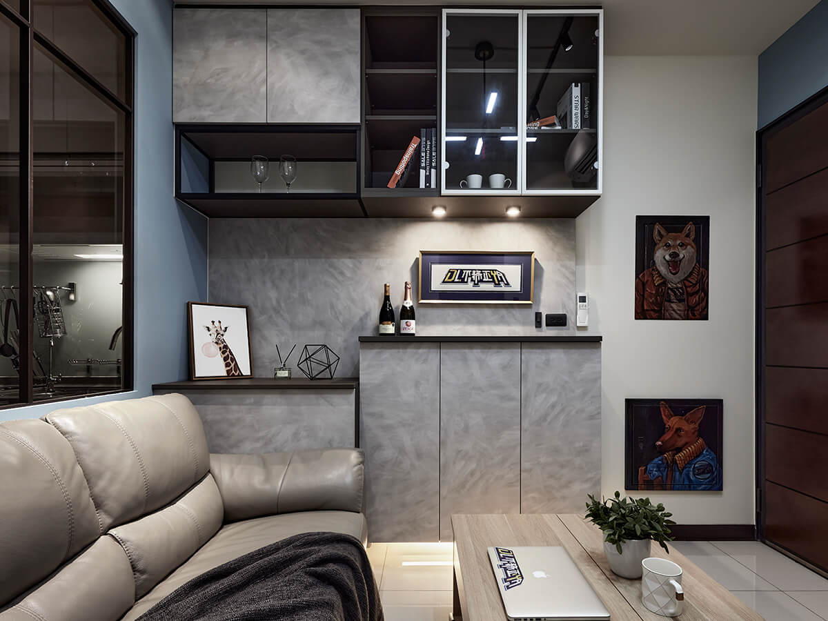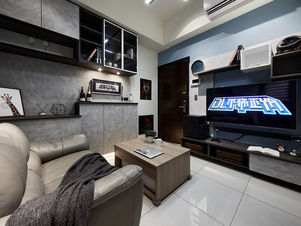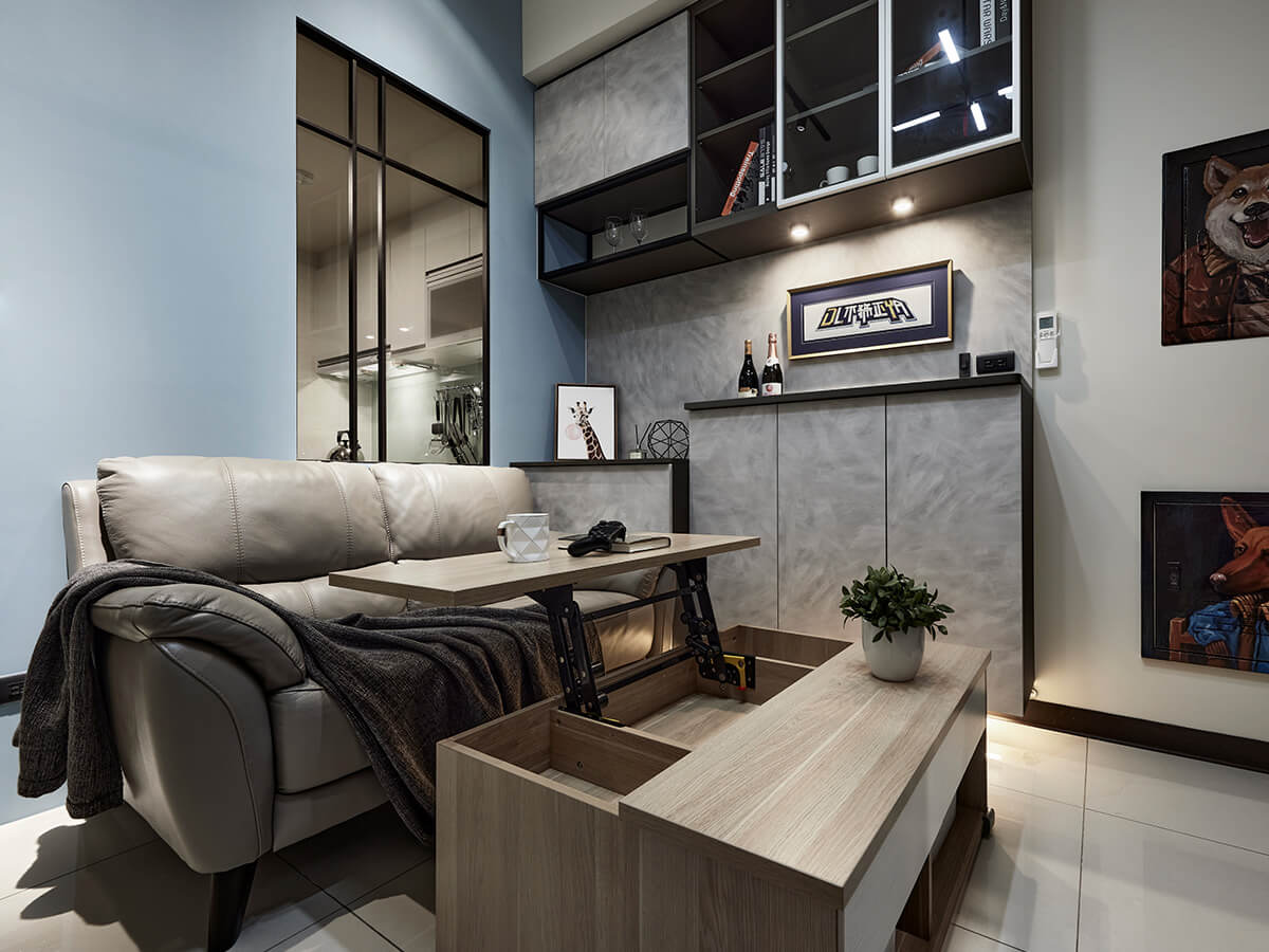 客廳佈局雖緊湊,但綠的傢俱細心為屋主增添可觀的收納空間,除了靠牆的鞋櫃、牆面上方的收納置物櫃,就連茶几桌面也可打開,方便靈活運用。