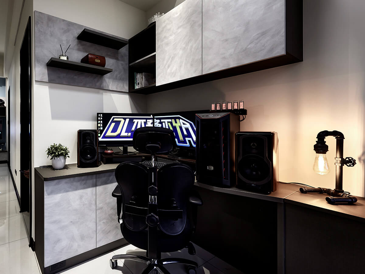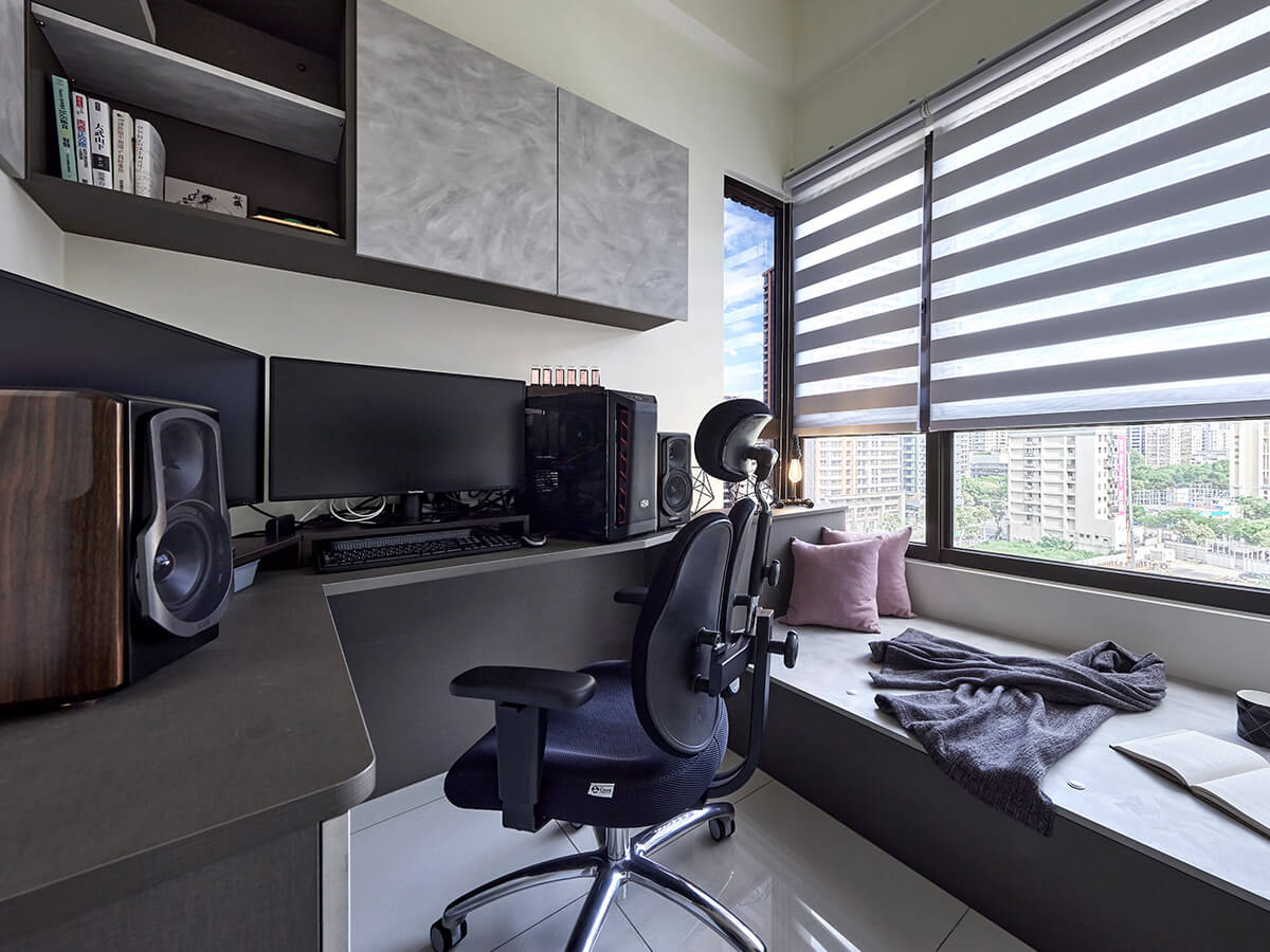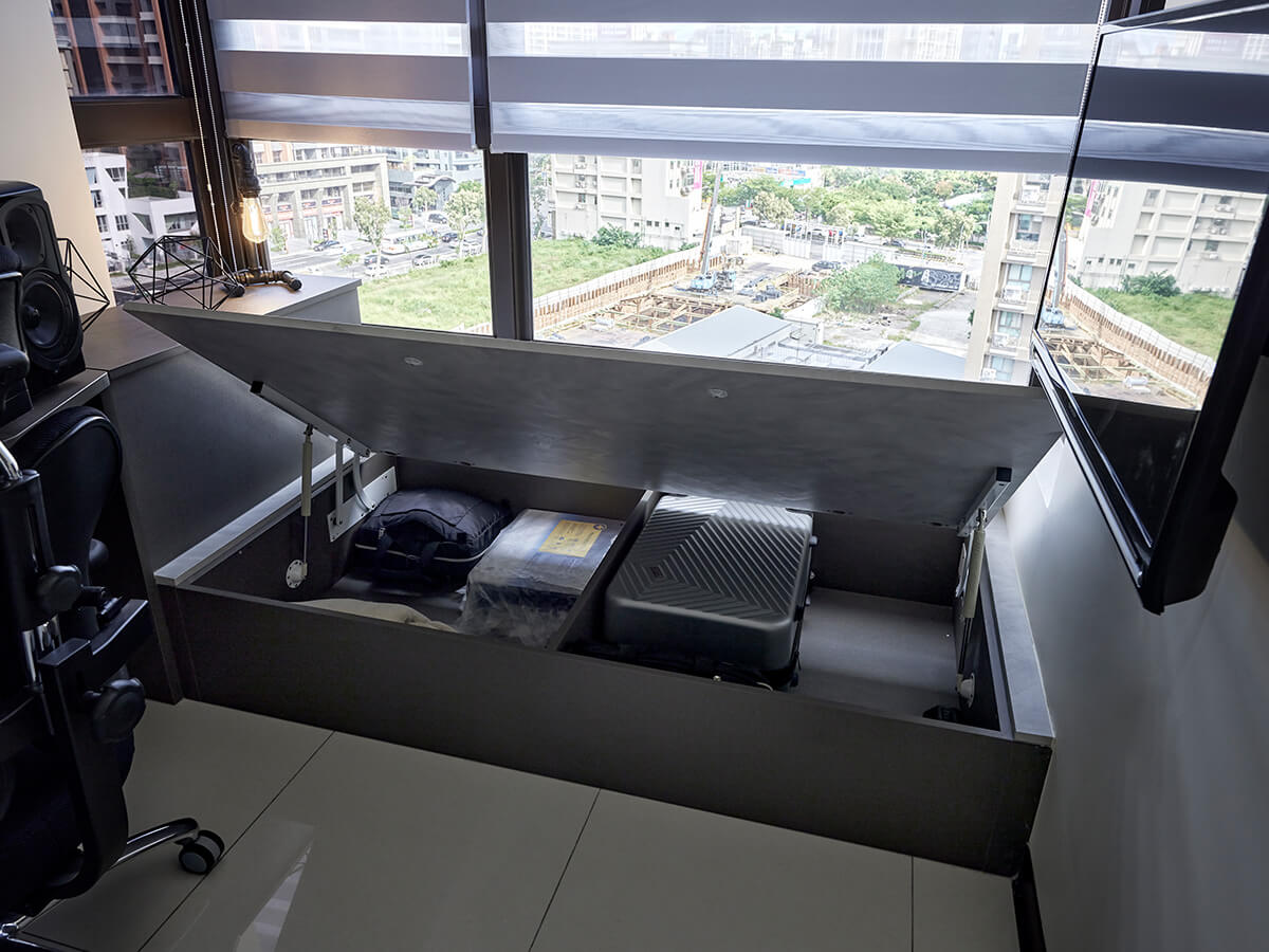整體設計亮點之一,是採光極佳的書房兼工作室,設計師在窗邊設置了臥榻,除了結合收納,高度也剛好可欣賞窗外景致,團隊如果在此剪片,累了就能在此小憩。