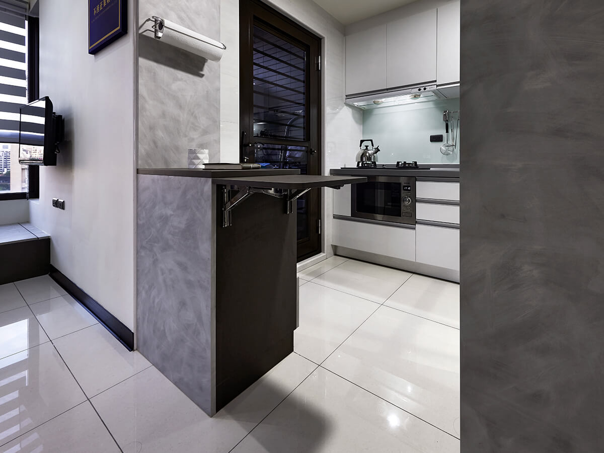 而設計師也發揮巧思,聰明運用有限空間,像是廚房走道就設計了上掀式桌板,平時收納起來,打開就是吧檯,增加更多運用彈性,讓整個新家,在輕工業風的質感下,完全貼合小宅的生活需求!