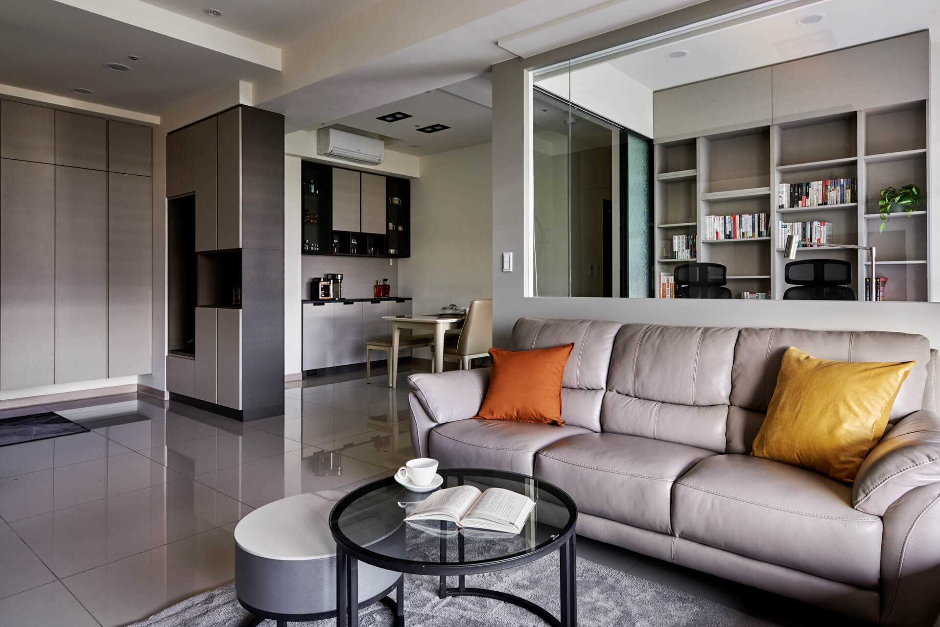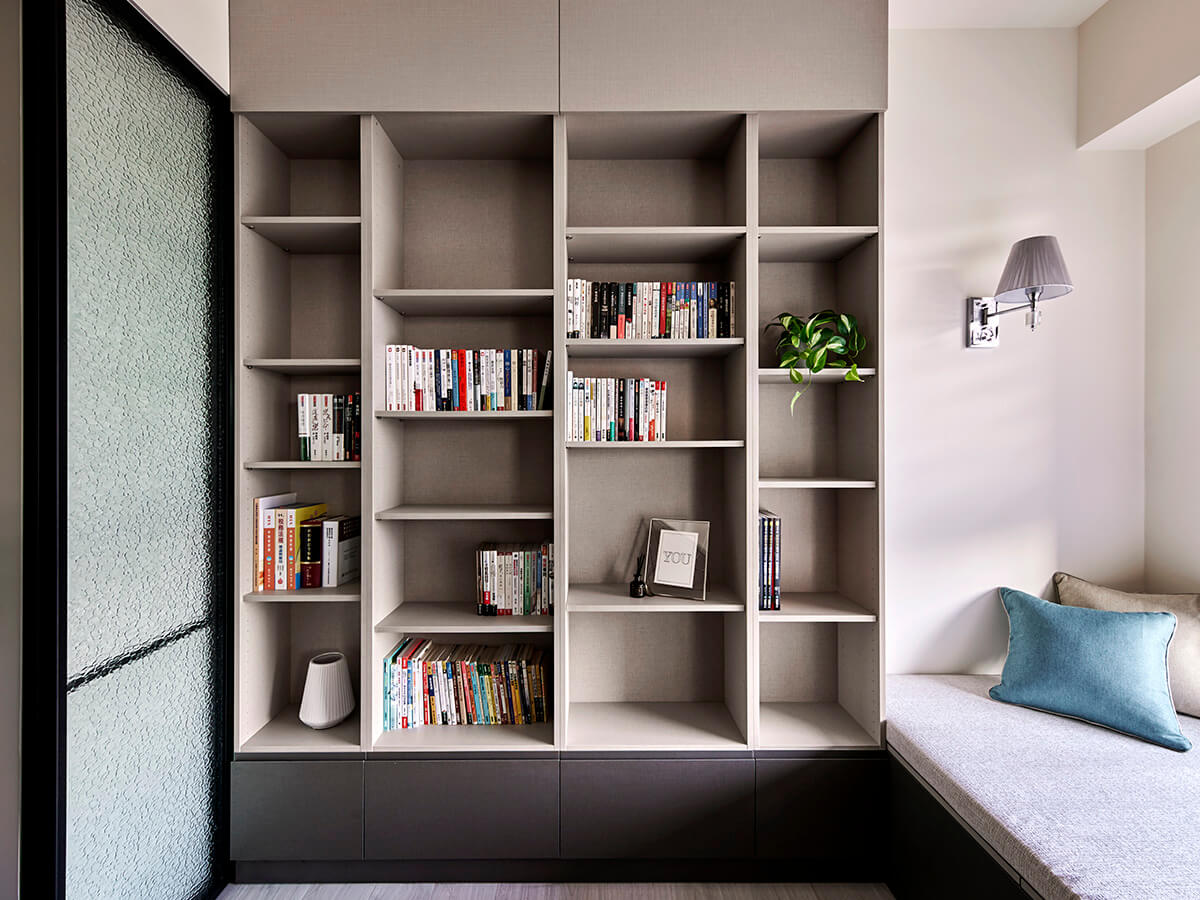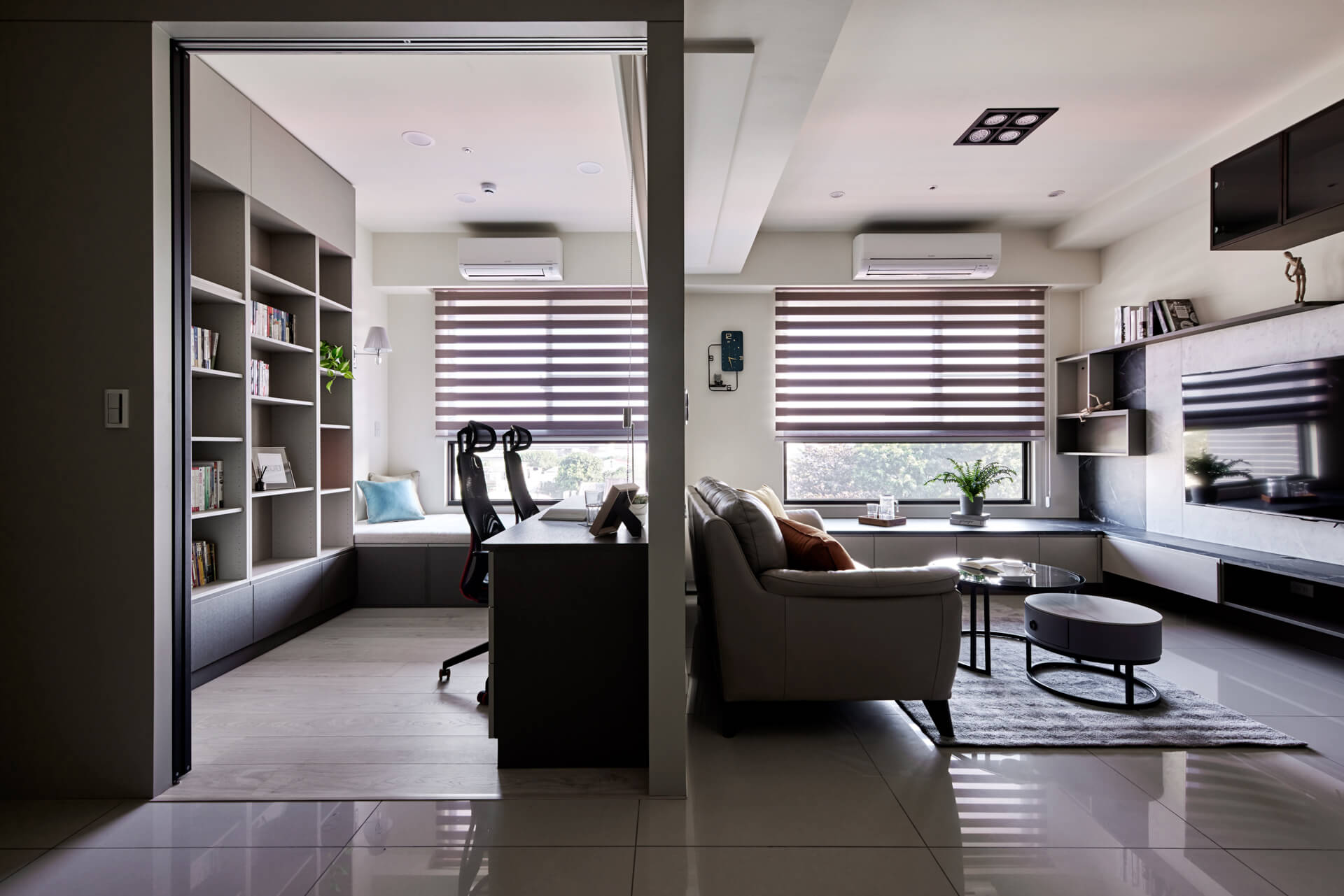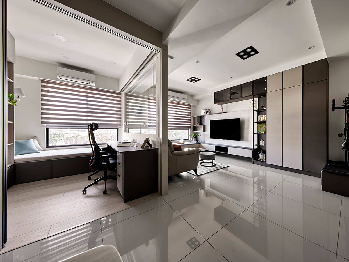 卸下實牆、釋放視線,以穿透玻璃模糊客廳與書房的界線,一筆連袂起的窗景,將日光效能極大化,亦可使心境頓時豁然開朗,依序憑藉系統傢俱量身訂製的優勢,貼合格局尺度砌築寬敞工作桌,使卷宗文件平整攤開,同步沿窗設置臥榻,裁定單人床尺度,即可使書房切換成客房,以多功能防概念大幅提升機能性。