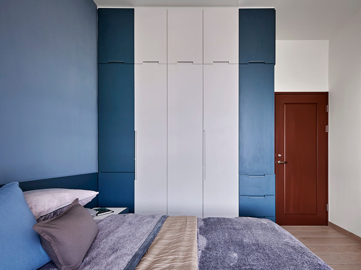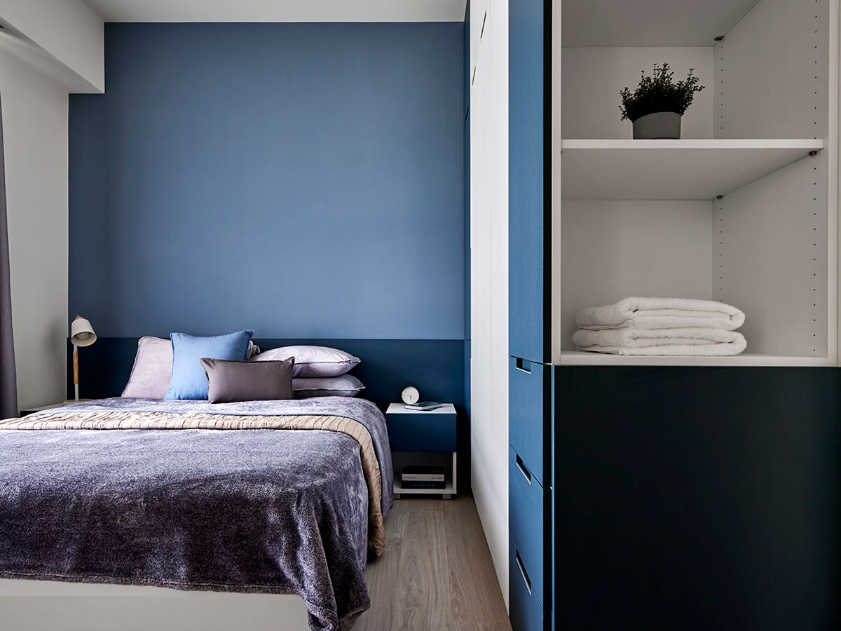 私領域,可說是反映自我內心狀態的場域,因此設計師經過深度暸解後,以許小姐心所屬的藍調當作主軸,從床頭板、衣櫃到梳妝台,採以純淨無瑕的「晶白」搭配簡約清澈的「波布藍」,調和出自然無拘的專屬場景。