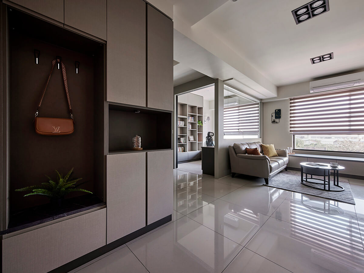 設計師接著說道:「一開始討論時,許小姐就有明確指出希望走簡約現代風格。」因此在搭配系統板材時,將輕奢典雅的「鈦絲褐」與簡約寧靜的「亞麻灰」相互揉合,依循玄關格局砌築鞋櫃與玄關櫃,堆疊出沈穩內斂卻不失高級感的生活場景。