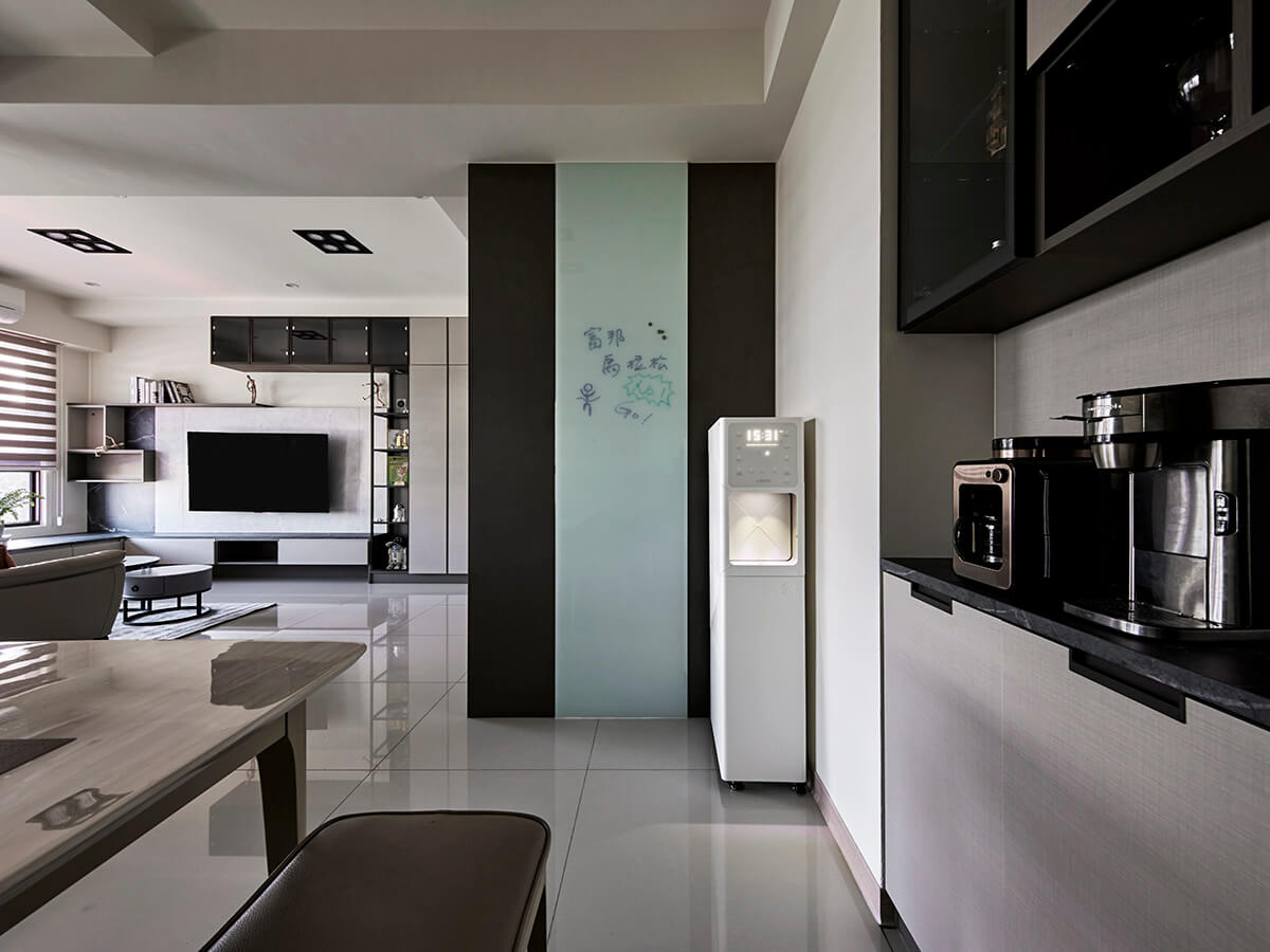 「她們平時也有在白板牆記載事情的習慣。」設計師親切說道,當時在仔細評估後,決定將其設置於餐廚一側,先於立面分別鑲上烤漆玻璃與鐵板,同時縝密計算直立式飲水機的寬幅,使白板牆與飲水設備宛若立面造型般,無違和地融合其中,成為家的專屬標誌。