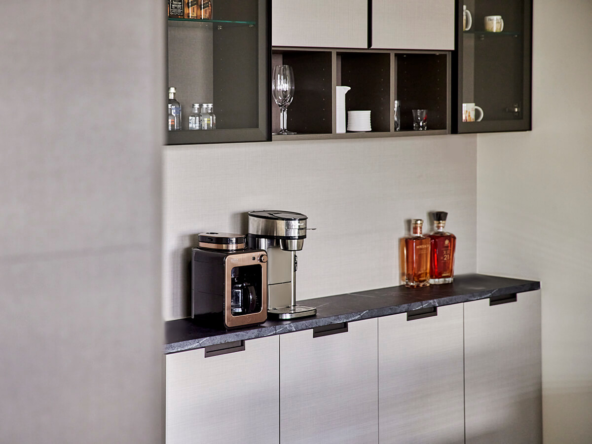 深知許小姐習慣早上沖杯香醇咖啡開啟一天,對於輕食吧台也有著念想,因此依循格局框築餐邊櫃,以上櫃涵括收納與陳列用途,使蒐藏的酒品與馬克杯有序擺放,下櫃則能擺上咖啡機成為一方小吧台,如實呈現心所屬的生活模樣。