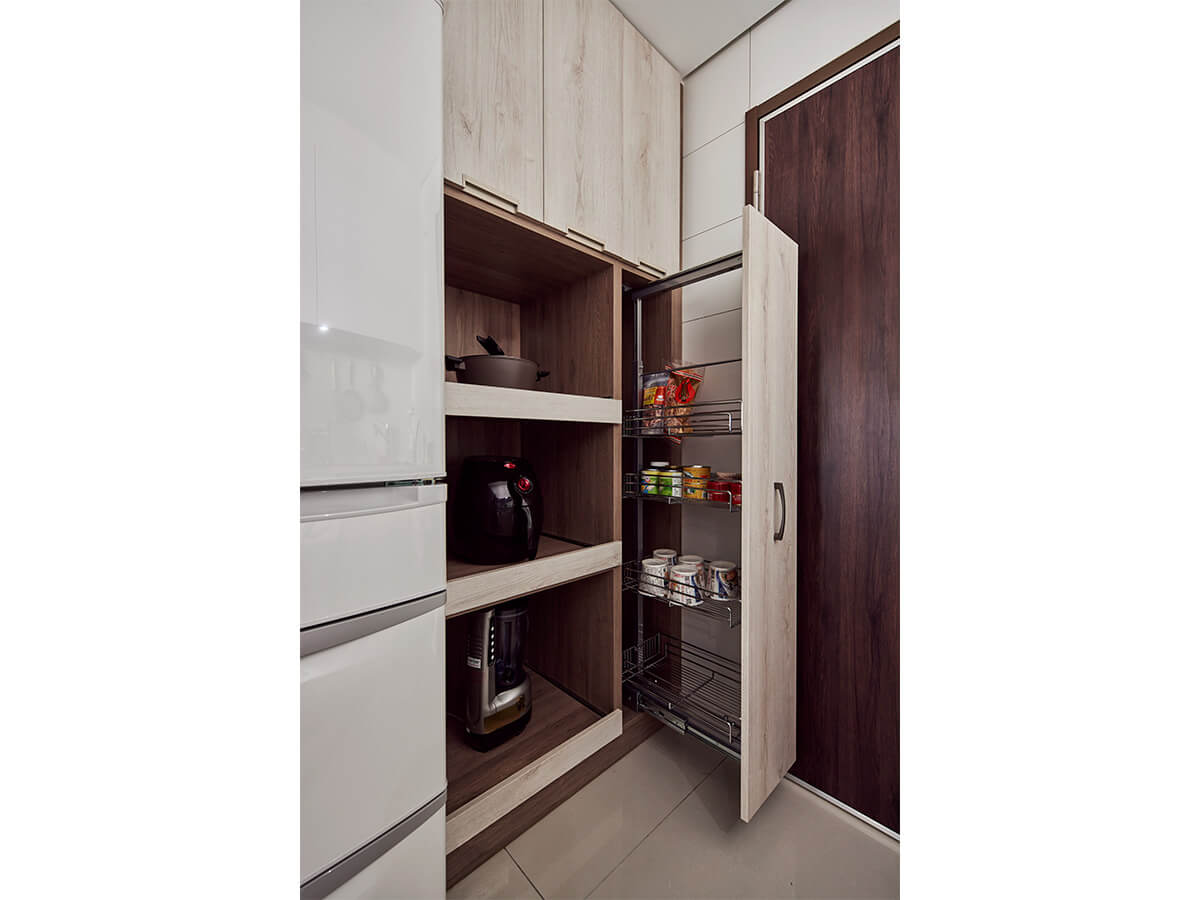 與此同時,鑑於建商原附設的廚房收納相對不足,因此希望有擺放各種小家電的空間,於是在評估後,專門訂製一座電器櫃,利用抽拉盤提升操作便利性,同步搭載側拉櫃儲放各種乾貨食品,許小姐開心分享:「設計師真的很用心,在設計櫃體時注意到各種小細節,讓使用更加流暢方便。」