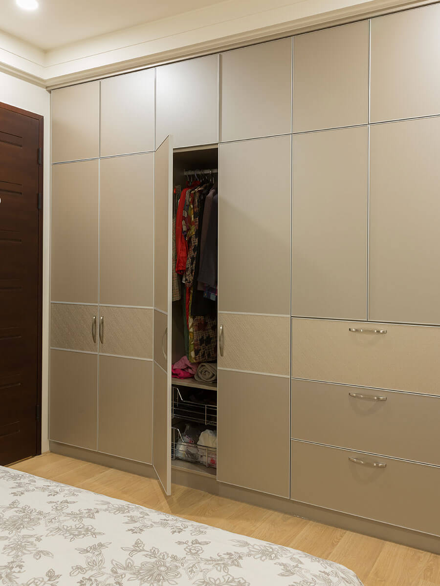 最搶眼的,是客廳一長排布織紋收納櫃,偷偷拉開一角,原來家中成員的大衣、外出服、鞋履,全都有條不紊收納於此。一體成形的內凹把手,以及家中成員稱讚有加的伸縮式衣櫃設計,不動聲色贏得全家人的一致好評。