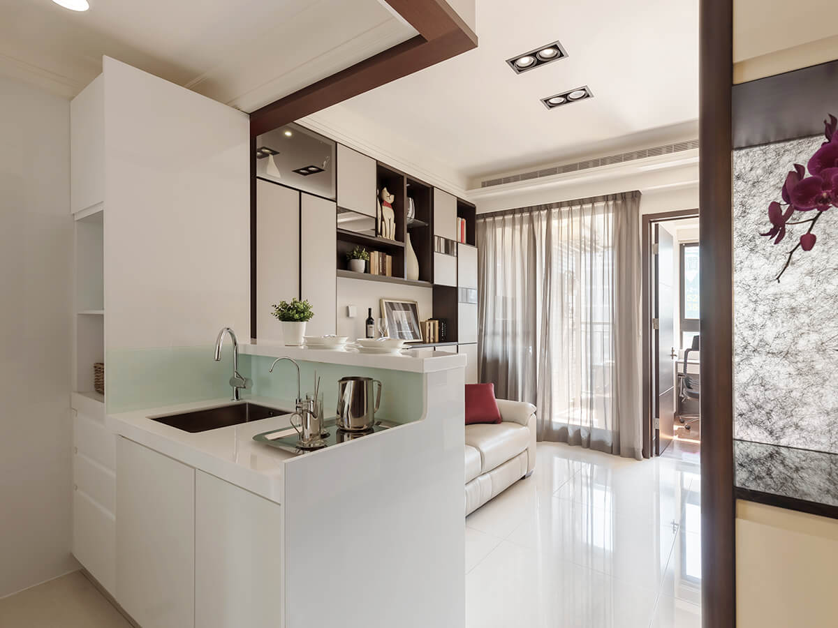 精品宅再加值,黃琪婷別出心裁在客廳和廚房之間設計一面簡單大方的吧台,男女主人就能面對面烹調、用餐、聊天,「綠的傢俱」做到如此盡善盡美,體貼入心,把溫馨的「家」帶給您,飯店、租屋遠遠無可比擬。