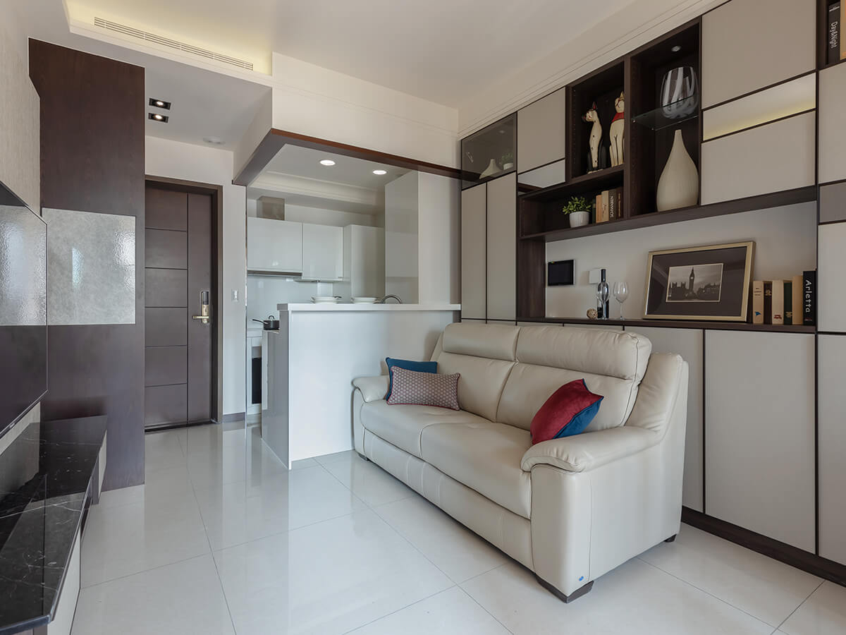 顧宅入門處,黃琪婷設計的深色木櫃充當小玄關,也讓顧太太讚不絕口,「綠的傢俱」木工把對外的直角磨圓,守護著主人出入的安全,中段透空,擺個花瓶,既有透視感,同時能夠提升氣氛,踱步到客廳,大理石檯面的系統櫃,比飯店房間還高檔,為後方牆壁特選的白色直條波紋立體壁紙,散發低調奢華美感,與對面的亞麻灰色布紋、灰鏡系列設計呼應,也讓客廳空間產生了擴遠加碼般的效應。