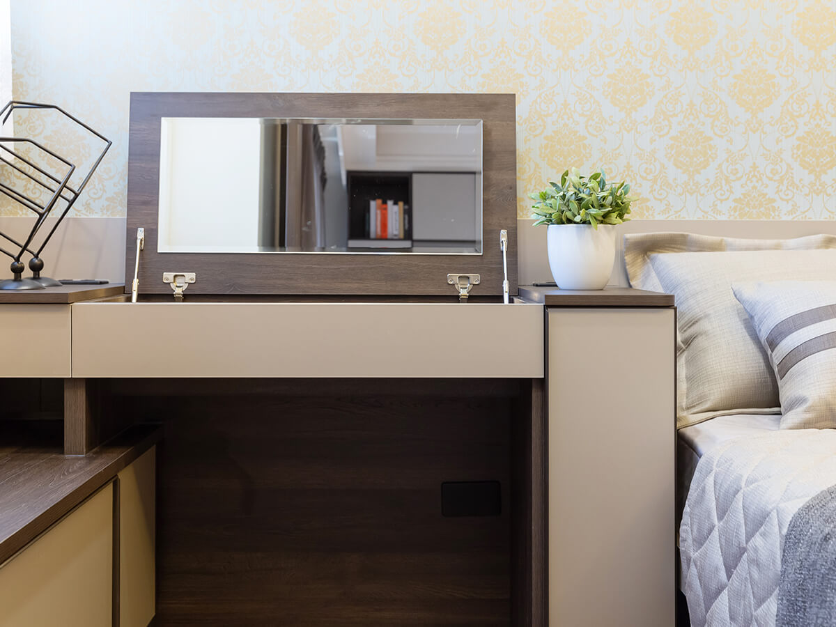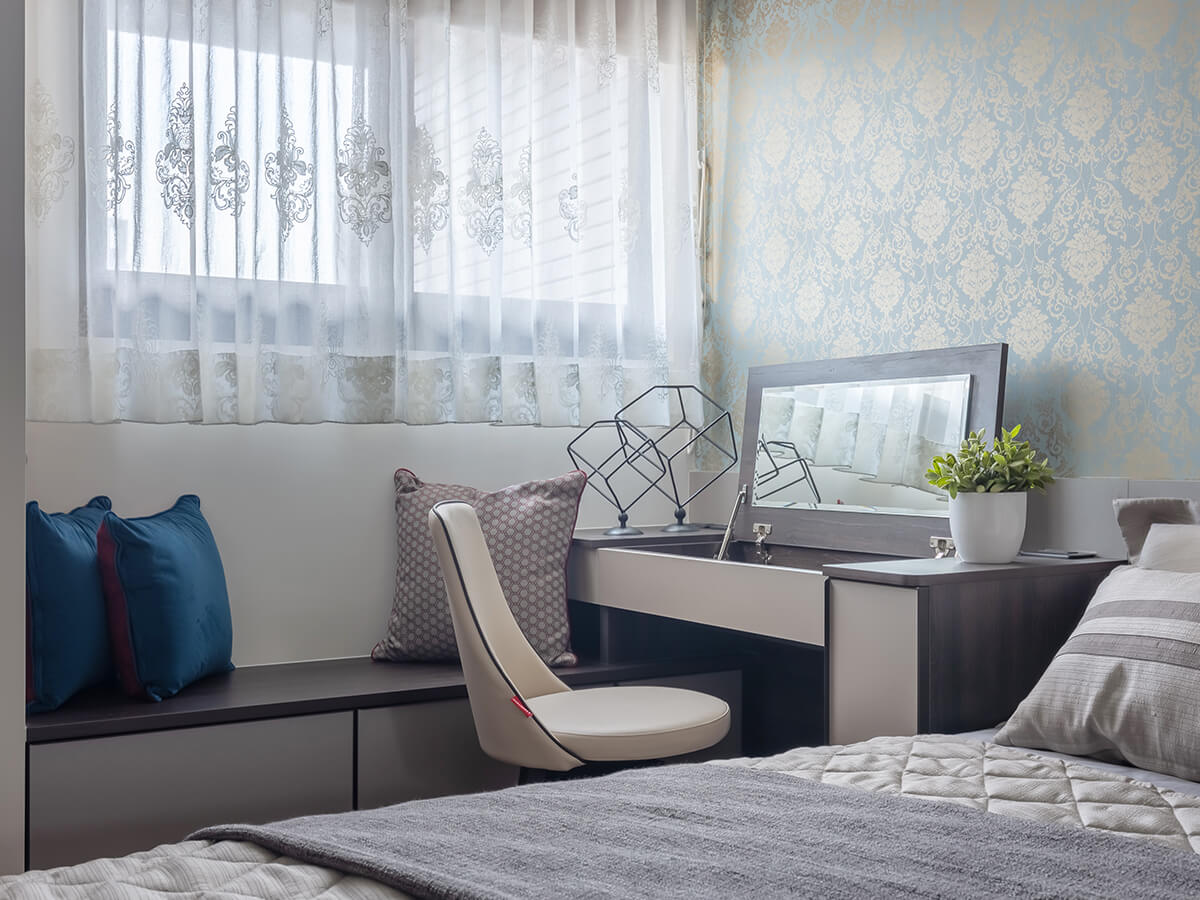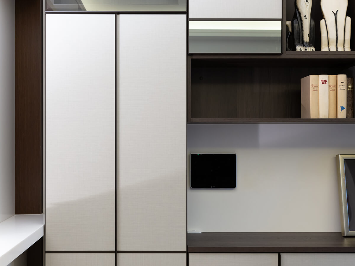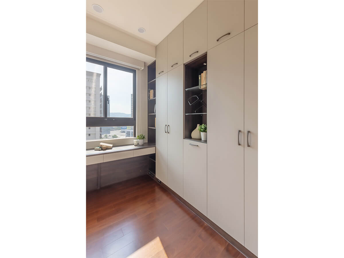 而為了善加利用空間,床頭旁的化妝桌、寫字檯二合一,掀起面板就是立式的四方鏡,略微往後傾斜的角度,照鏡梳妝,符合人體工學,全都在3D模擬設計圖階段就已計算得分毫不差,靠窗的椅櫃可收納東西,也可讓男主人坐下休息,顧太太想幫床頭櫃裝鎖以便安放重要文件,黃琪婷也特地配鎖,以顧客為尊,合乎需求,贏得顧太太百分百放心:「設計得很好,我完全滿意。」尤其當時顧先生夫婦1個多月都在國外,黃琪婷用line報告進度、拍照看景、對圖確認,顧太太十分嘉許:「比如衣櫃上方的櫃子,採用往上掀門的設計,塞放被子的時候,不必擔心碰到頭,一切都這麼便利、實用、有質感,看著舒心合意,我只要拉著行李箱入住魔法屋就成了。」