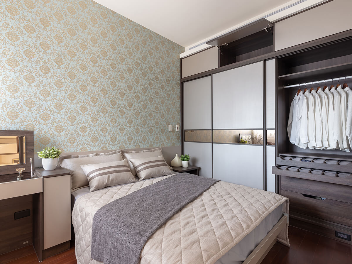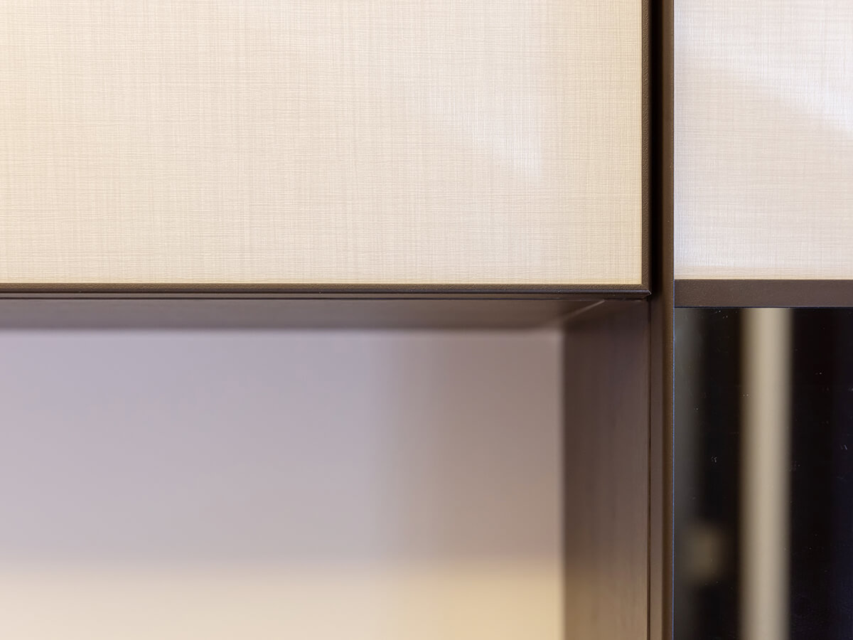 拜訪位於新莊副都心第一排的顧家新居,爽朗的顧太太直指主臥室銀灰底色的壁紙說:「就是你們幫我選配的這金色牡丹花樣,完美搭配衣櫃色系,好美,讓我一見傾心。」「綠的傢俱」系統櫃設計師黃琪婷解說,趨近日式簡約風格的色系呼應,只以線條為裝飾,可以創造空間的延伸感,正如木質衣櫃與鋁框的異材質結合,中間安裝茶鏡,既很時尚,更有擴大、穿透空間的效果,打開衣櫃,別致地配置多層分隔式抽屜,方格層可供擺放領帶,細心、周到,無微不至。