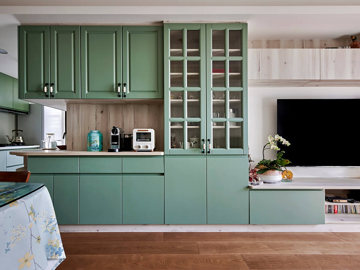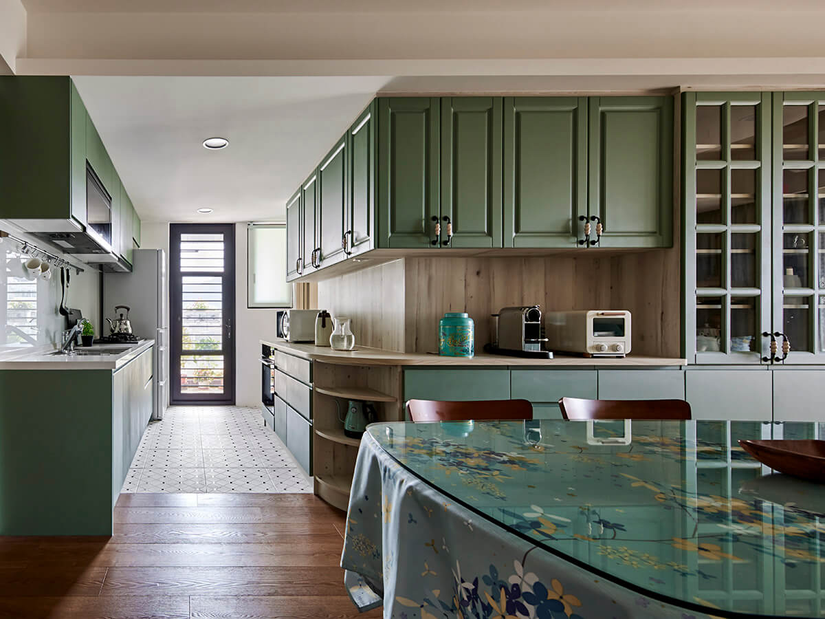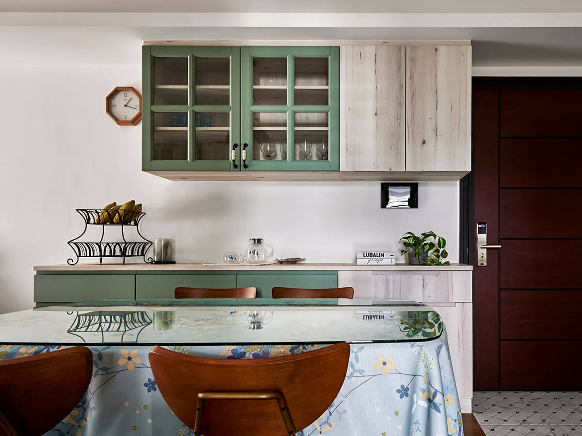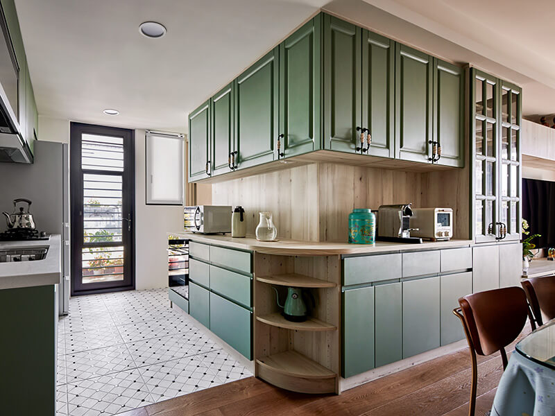 沿著玄關望去,廚房秋谷綠與淡木色打造的餐櫃為鄉村風設計奠定了基調。末端的餐櫃還有小小巧思,檯面在不敷使用時可以拉開上層抽屜櫃,將其抬起與檯面平接,搖身一變成為延伸的工作檯,方便準備各式料理與烘焙。為了建置崁入式面板,與置放烤箱,必須加深其櫃體深度。設計師精巧地運用延伸式五金,打造隱藏式檯面。巧妙的設計其實隱隱透露著生活的軌跡,這正是秋谷綠鄉村風設計最好的佈置,精緻與質樸並存,也蔓延著主人專屬的溫度。
