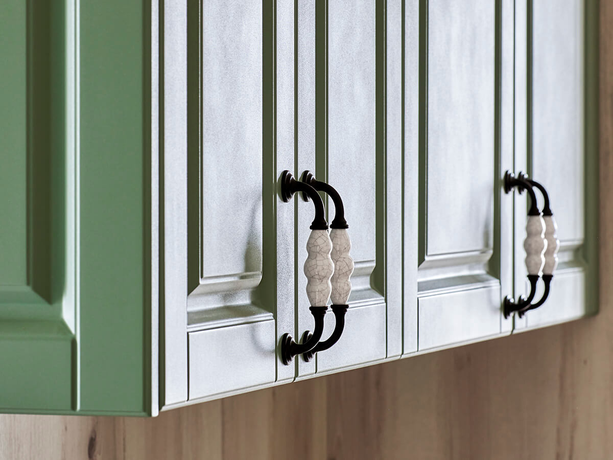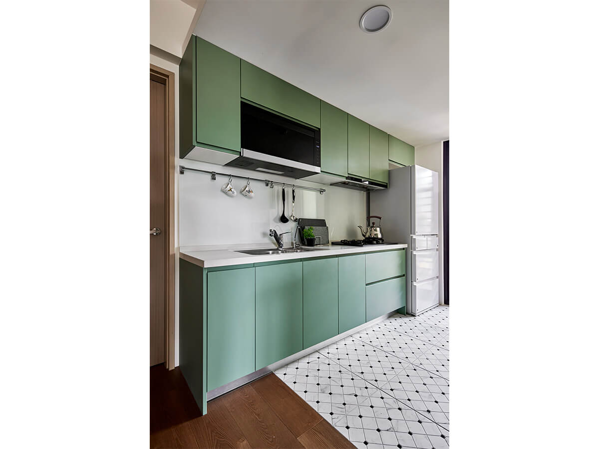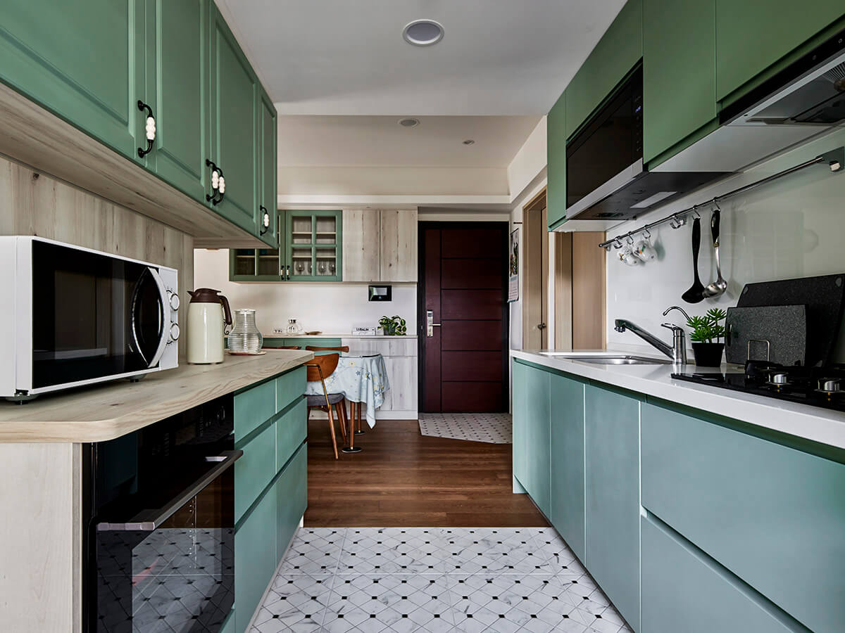 沿著玄關望去,廚房秋谷綠與淡木色打造的餐櫃為鄉村風設計奠定了基調。末端的餐櫃還有小小巧思,檯面在不敷使用時可以拉開上層抽屜櫃,將其抬起與檯面平接,搖身一變成為延伸的工作檯,方便準備各式料理與烘焙。為了建置崁入式面板,與置放烤箱,必須加深其櫃體深度。設計師精巧地運用延伸式五金,打造隱藏式檯面。巧妙的設計其實隱隱透露著生活的軌跡,這正是秋谷綠鄉村風設計最好的佈置,精緻與質樸並存,也蔓延著主人專屬的溫度。
