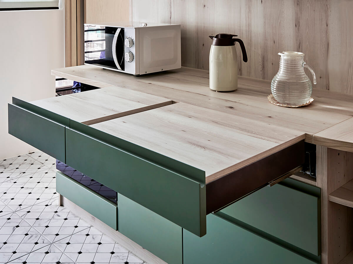 針對屋主的需求特別設計的隱藏式延伸料理台桌板為廚房增添不少使用上的便利,讓熱愛烹飪的屋主可以有足夠的空間準備各式料理,在收納時也很方便,完全不佔空間。