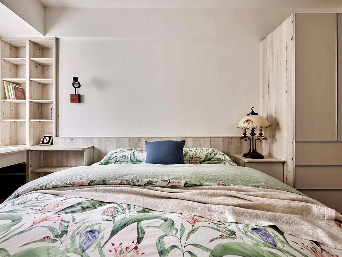 為了讓空間更集中,設計師捨棄床邊櫃的設計,改以臨窗的書桌打造次臥的空間。同樣以淡木色建構書桌與床架,一室的淡木色帶來濃郁的鄉村風,讓窗光引進時再次強化了自然氛圍,無形中也放大了整體空間。