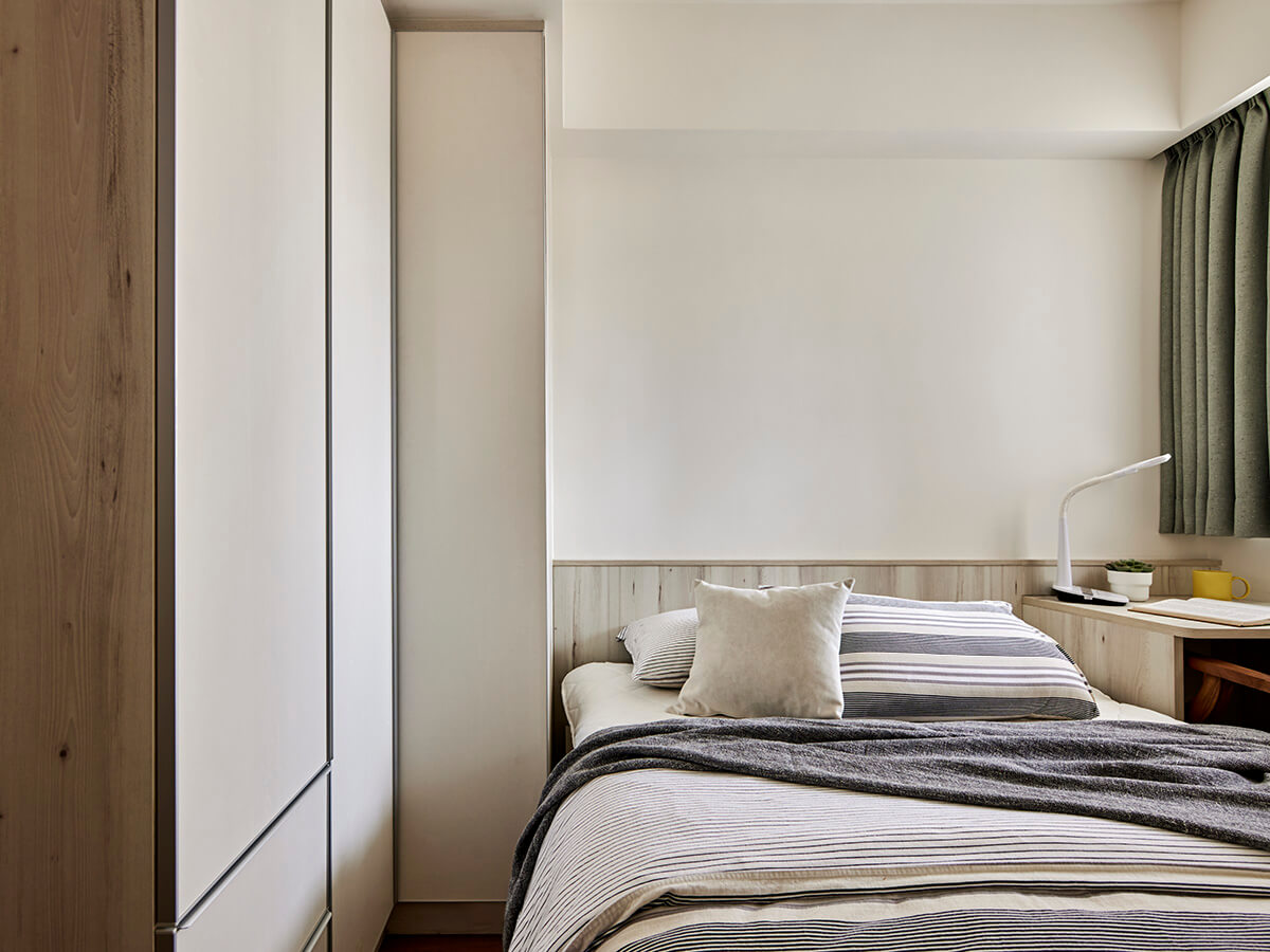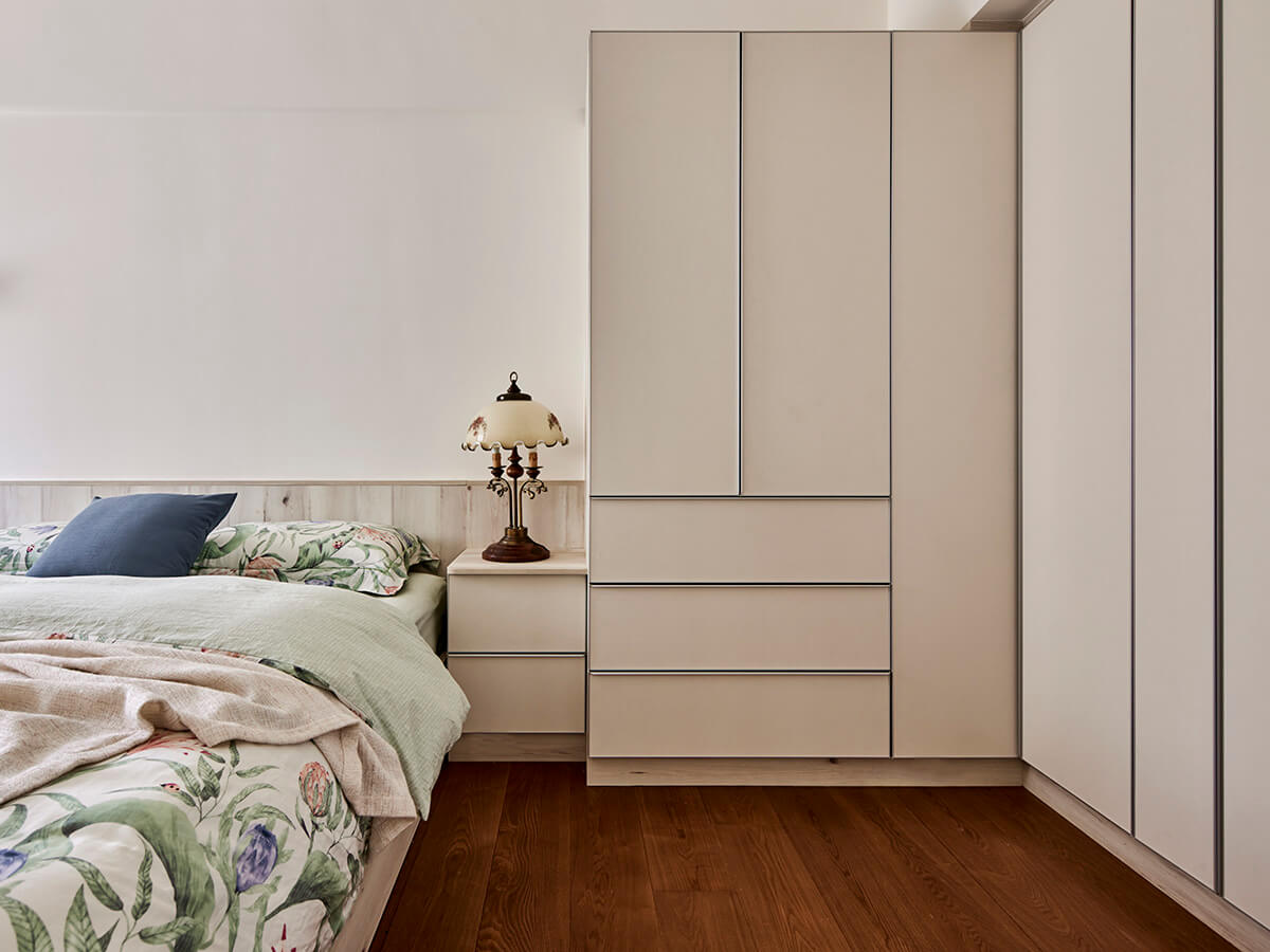 靠牆的衣櫃則以淡木色建構,門片是鋁框搭配鑼帛,營造出清新且自然的室內設計。床架的選色也與櫥櫃一致,淡木色再次充當主角;尾掀式的床架既方便收納使用,也有偌大的容納空間。主臥整體愜意放鬆的空間感,是褪下疲憊最好的去處,也是主人最喜歡的小天地。
