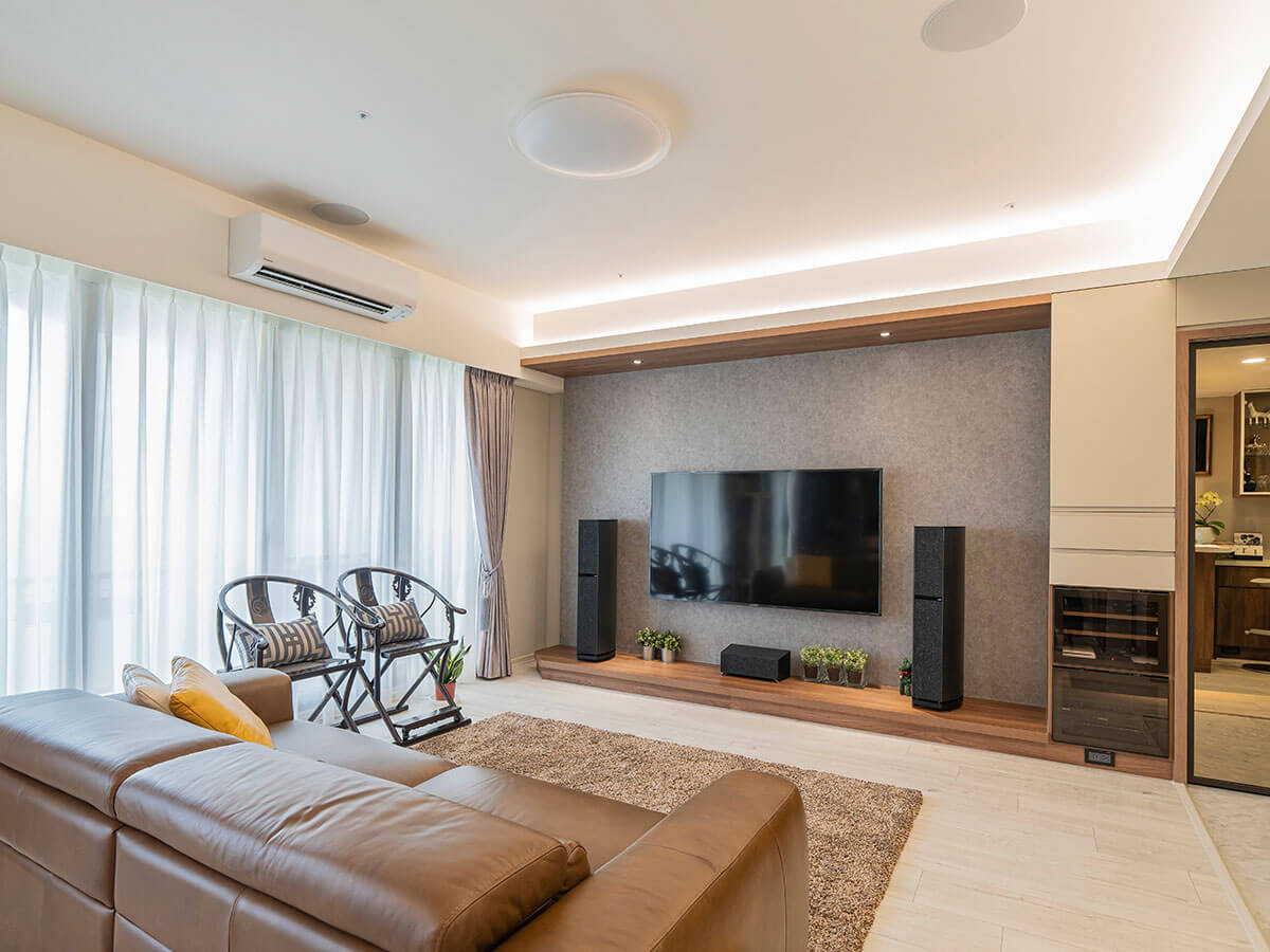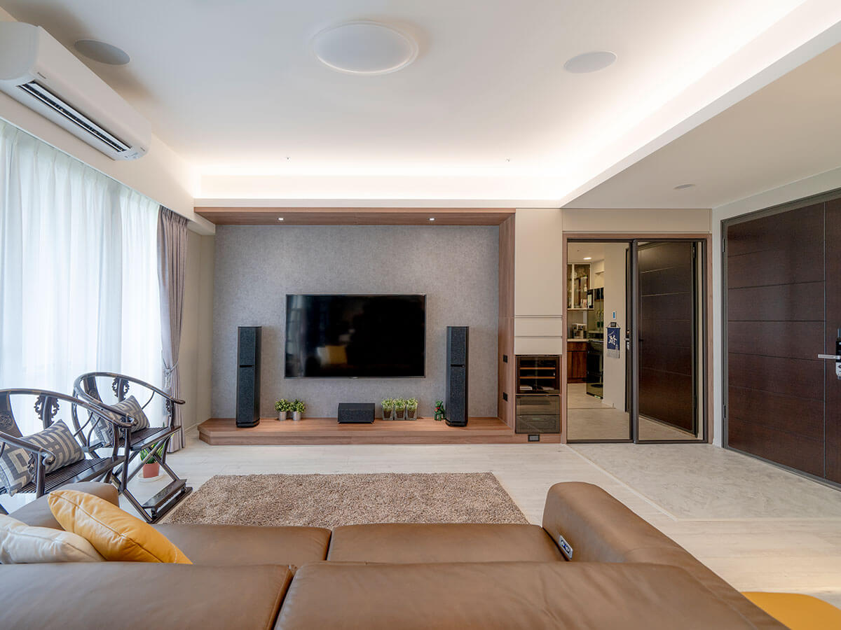 隨著主人打開大門,訪客的視野直接穿越過寬闊的客廳,接壤窗外約莫有半個大安森林公園面積的綠樹綠地園區,心情像藍天豁然開朗,「哇!難怪劉先生看中這戶二手屋,價值百萬元的VIEW,真有眼光,房屋包管保值還增值。」走進客廳,發現右手邊動線上的客餐廳串連為大坪數的開放空間,左手動線則是中島吧檯轉進廚房,兩側中央是走道,通往主臥室,而通道左邊的全面木牆,其實有著隱藏版的衛浴空間和預設嬰兒房在其後,不讓片段的高矮隔間面板牆擋住了流暢的視覺美感。右側由鏡面推拉門揭開開放公共空間的序幕,拉門裡是鞋架和可順手吊掛衣物的偌大空間,電扇、行李箱、嬰兒車都擺得進去;向內延伸,整組高到天花板的鄉村風系統櫃,可儲物,可展示,上半部為米白色澤櫃體,下半部採用玻璃櫃,跳脫出變化,又好整理;蔣妮恩善用既有原木橫樑,與天花板之間形成層次感,為電視牆選用的仿石紋壁紙、煥發雲石自然元素,彰顯輕鬆氛圍,電視下的原木紋平台兼可收納小物件,至於電線則收納到壁紙牆後的夾層,毫無阻礙; 再往後,配合主人的意願,打掉一間房間的隔間,改成無牆式的餐廳開放空間,周家暐規劃的音響兼書籍收藏系統櫃,正好與客廳的系統櫃對比,變成上方暗色玻璃、下方白色櫃體板材,同中求異有趣味。在各個空間共存且彼此呼應的,是耐磨木地板,有著原木紋理的淺灰色系木地板,散發一股輕工業風、掃地機器人靜悄悄完成家務,迎來一夜靜謐。