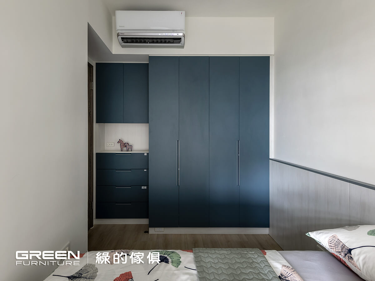 鑑於夫妻倆傾心於簡約清爽、穿透明亮的風格。因此從客廳開始,即以白栓系統櫃搭配淡雅的鑼帛系統門片,定調出現代簡約風的客廳設計。私領域則以沈穩中性的「波布藍+麻紗米」當作主軸,給予寢室一份安定力量。