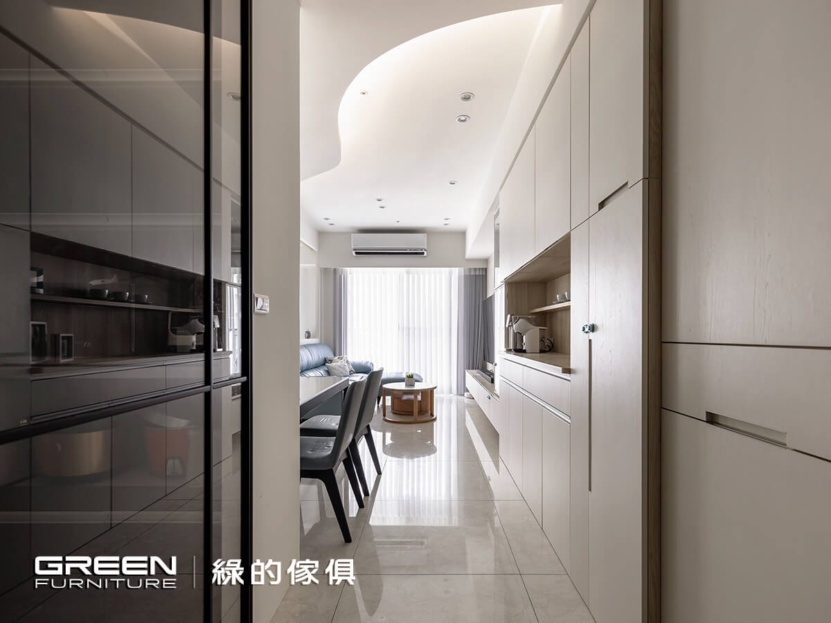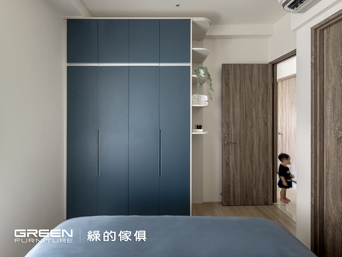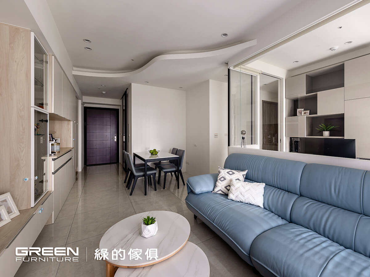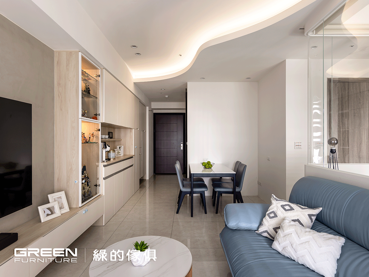 育有一兒的陳氏夫妻,對室內空間的開闊、收納與安全性特別重視,希望小朋友可以無拘無束的在家裏頭奔跑玩耍。也因是別具意義的第一間房子,在尋找室內設計公司時,立刻想起家人長期使用,並且價格透明又親切好溝通的「綠的傢俱」,極佳的品牌信譽令他們感到放心,而成果也確實遠超乎預期。在經過縝密細心的配置後,一個簡約清爽、穿透明亮的家逐漸顯現,而每個角落以圓弧妥帖修飾,讓身為父母的他們感到安心,使一家三口過上美好生活!