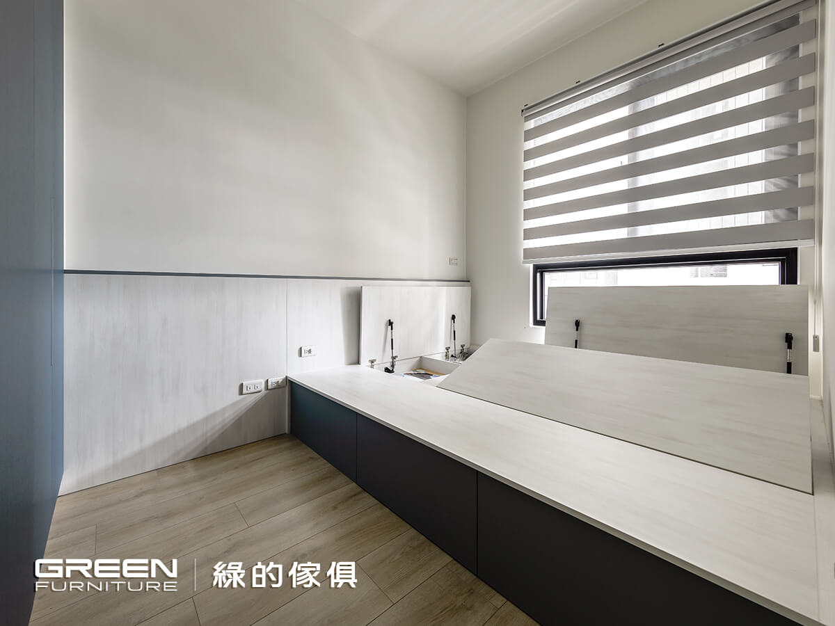 深知夫妻倆對於健康的重視,加上顧慮到家中幼童,因此全室採用通過歐盟最嚴苛環保標準的「綠的傢俱」系統櫃,不用擔心甲醛危害,在施作期間也能大幅降低粉塵問題,同步使用尚約門把手,一來可根據使用習慣與整體設計客製化,二來則能杜絕磕碰,使小朋友可以自由自在的玩耍,父母也才能真正感到放心。