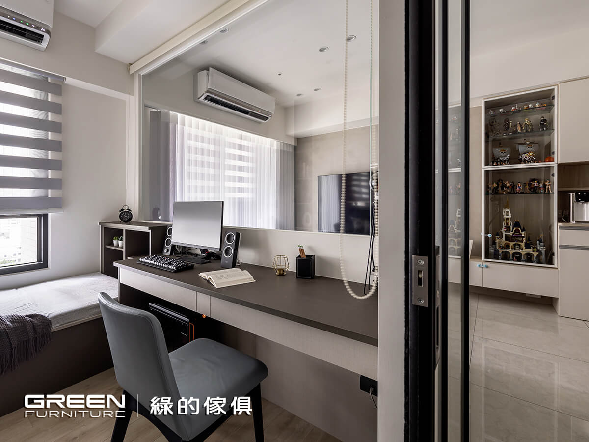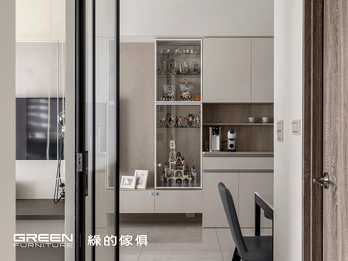 極簡純淨的鑼帛系統門片,是現代簡約風客廳不可或缺的元素,同時搭配清玻璃消弭壓迫感,使客廳具備開闊穿透性,而展示櫃的設計,源自體察女主人心中的想望 —— 曾在十年前從美國迪士尼買了樂高,但因沒有合適的擺設空間,所以一直未開封,自從有了展示櫃後,她便每天趁著孩子睡覺後,在深夜慢慢組裝,再將用心組裝的樂高好好擺放陳列,實現了心願。