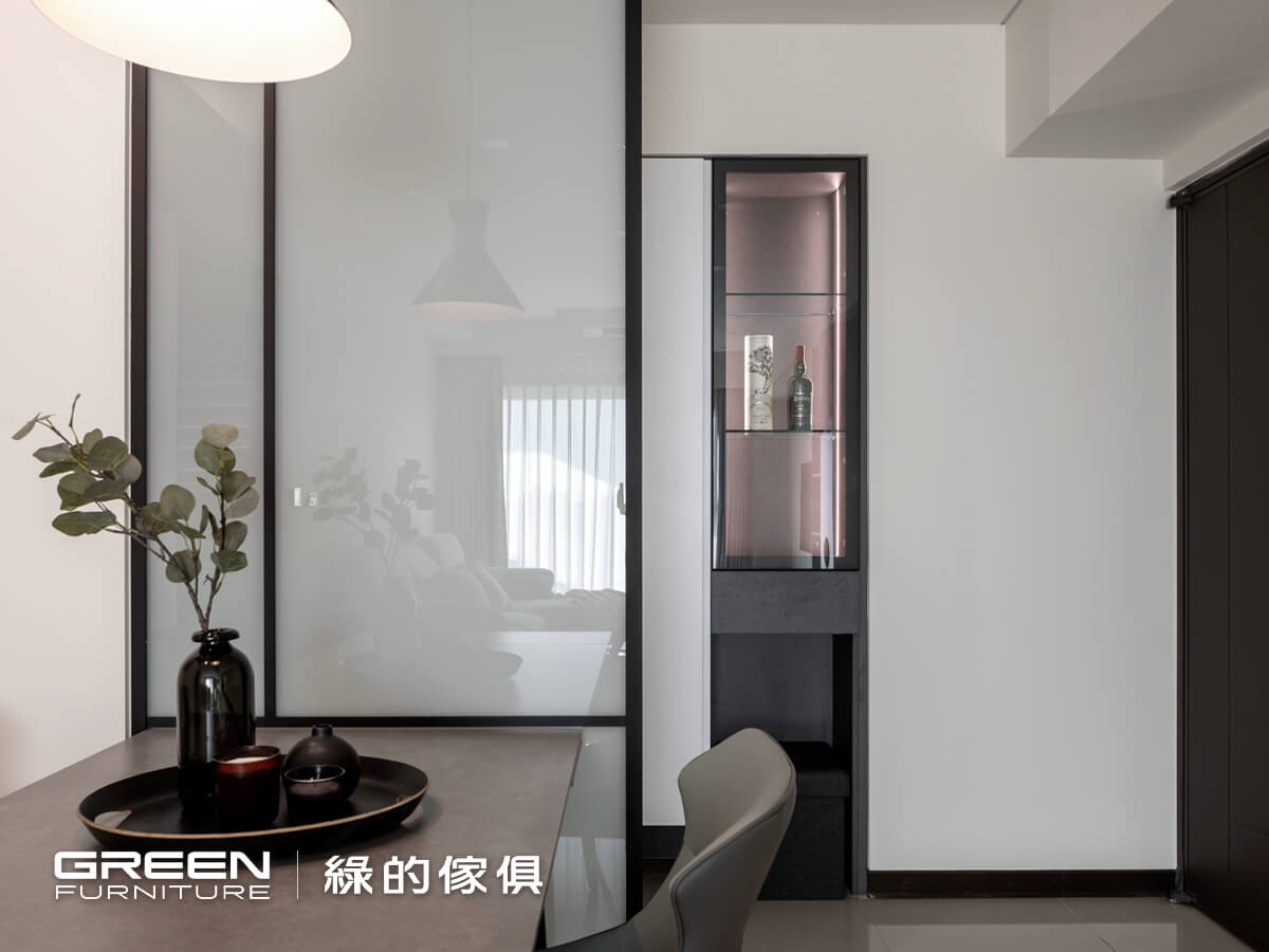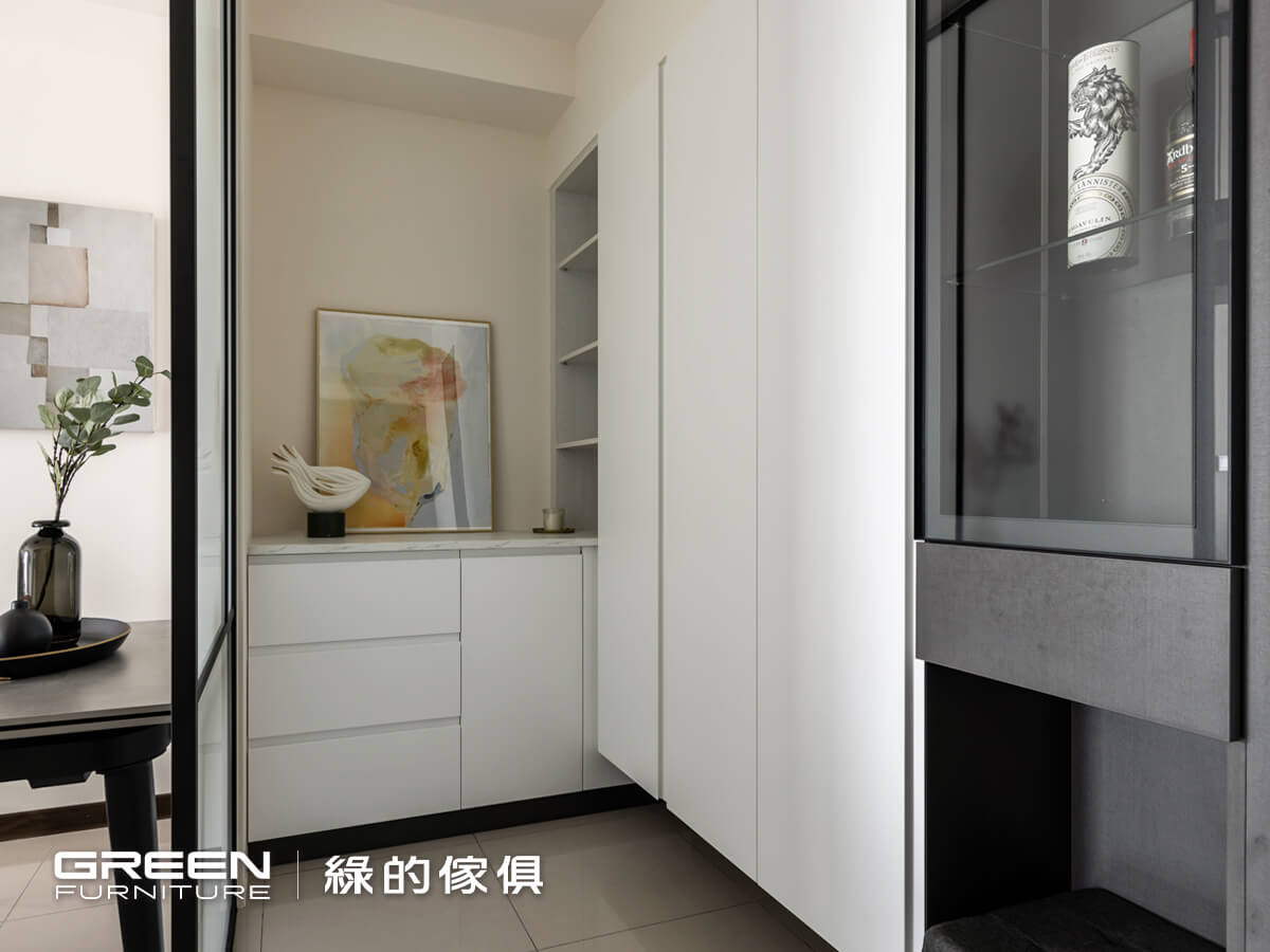 入戶的訂製系統櫃配置了低調的布織黑酒櫃以燈條加鋁框門與玻璃層板組合而成,櫃體懸空之處,可隨興置放穿鞋椅、植栽或花器,留白的空間,充滿無限自由的想像,是現代風格設計裡,多變且個性化的特色。