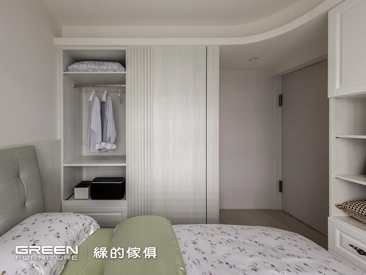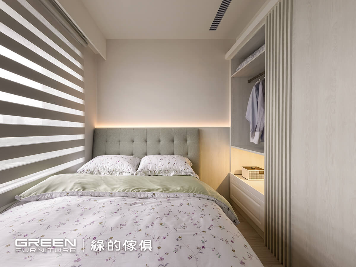 考量屋主重視收納,次臥規劃為兼具客房與儲物的多功能空間。一進門右側即設有整面量身訂製的收納櫃,可靈活容納換季衣物等物品。