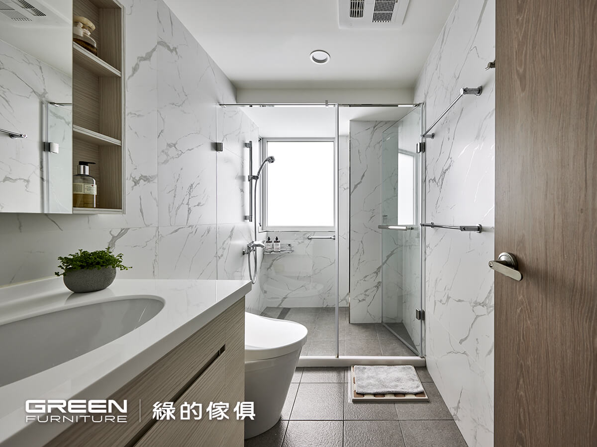 整體空間採用大面積白色大理石紋磁磚,營造明亮寬敞的視覺感受,搭配木質調櫃體增添溫潤氛圍。洗手台採用一體成型檯面,易清潔且線條俐落。鏡櫃結合開放與隱藏式收納設計,機能與美觀兼具。淋浴間以玻璃拉門分隔乾濕區,提升使用便利性並保持整體空間清爽。窗戶引入自然光,讓浴室更具通透感與舒適度。