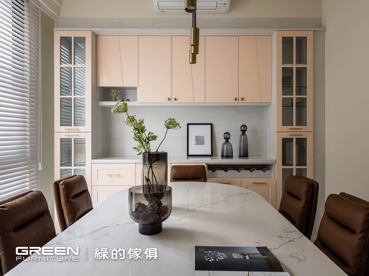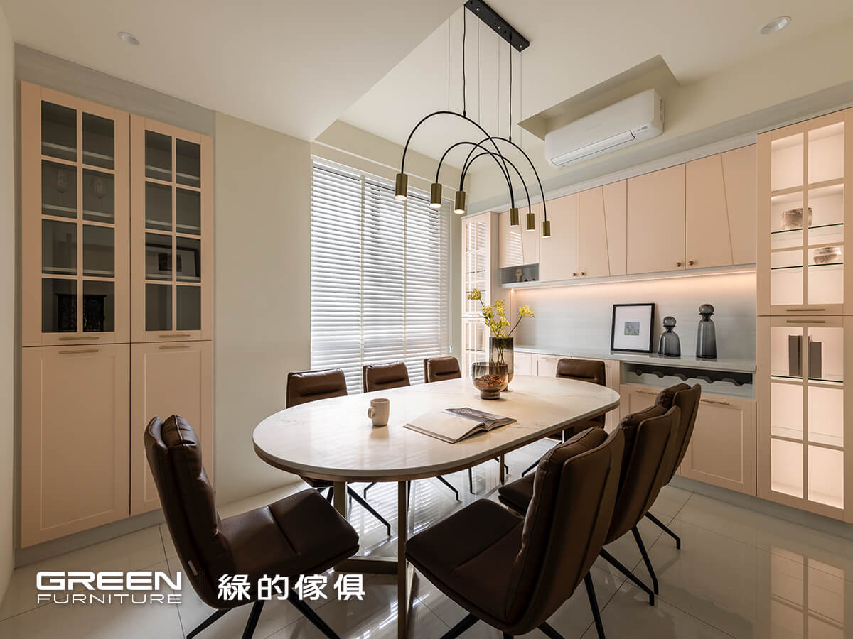 延伸廚房中島的基調,客製的石英石大餐桌,搭檔特製的霧滑金屬腳,駕馭著三代同堂且莊重的用餐空間。餐櫃的系統板材雙粹門,霧面與亮面不同的工法彼此呼應;以賽麗石鋪墊的檯面,下方搭配霧滑烤漆的現代鄉村風系統面板,再以金色框條收邊