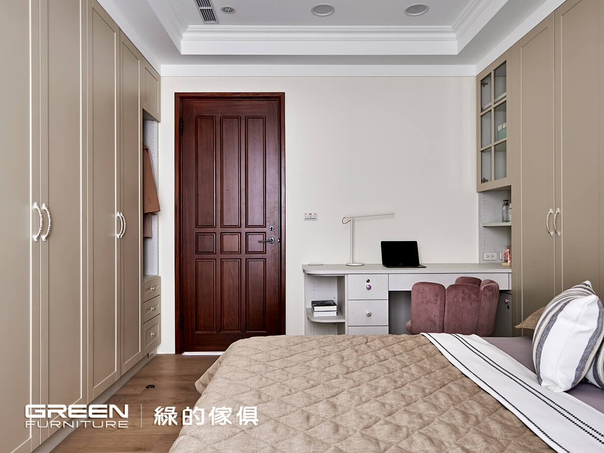 女兒房整體使用淡雅的奶茶色系做搭配,鄉村風線條門片不動聲色的書寫恬靜,溫柔之中透露出高級感,寬大的桌面讓日常辦公及梳妝打扮上更為順手,靠近床頭的收納櫃門片巧妙使用菱花門片及玻璃弱化樑柱以及滿牆的櫃面產生的壓迫感。