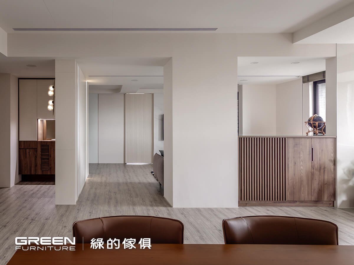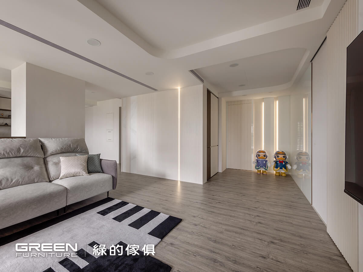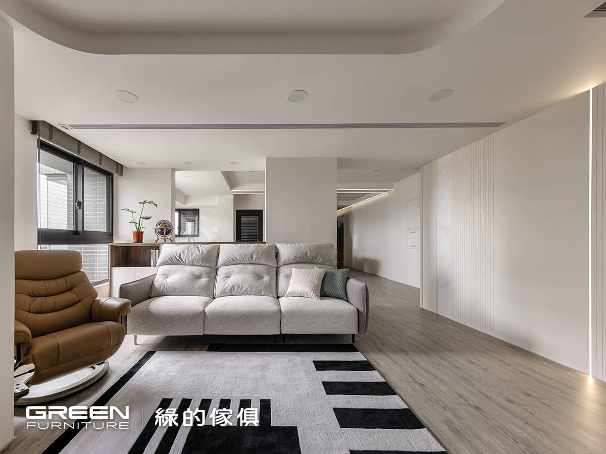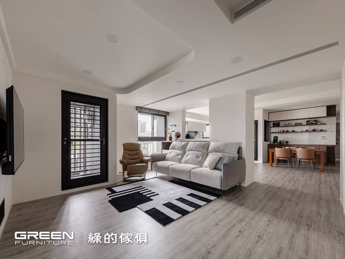 由於家人平常多在餐廚區活動,客廳以留白為核心。用系統板材打造餐邊矮櫃 取代實牆,不僅可以將餐廚與客廳自然分界,更維持整個公領域空的通透感。天花板使用弧形柔化大樑線條,也創造更高的空間感;整體色彩採用中性暖灰與木色調,讓空間猶如安靜的呼吸,在忙碌與寧靜之間找到平衡。