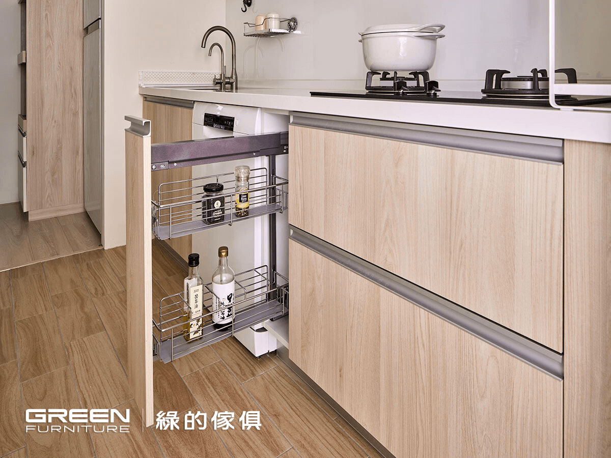 重視健康的女主人,對於孩子們的飲食也是一手包辦,因此採取獨立廚房設計,即使天天開伙料理,也不用擔心油煙溢散,針對收納機能,將電器櫃與冰箱配置於餐廳一側,減輕烹飪空間的負擔,一字型廚具則根據下廚習慣調配櫃體,其中,佐以層架與側拉櫃,即能有序擺放相對瑣碎的香料瓶罐。