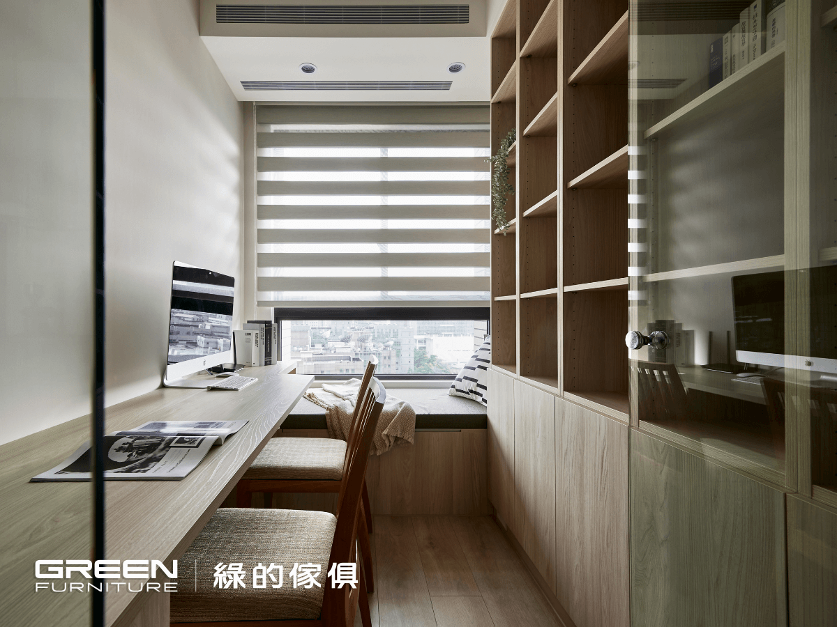 將客廳使用輕隔間分出獨立式書房,滿足男主人辦公的需求,並於採光最佳的地方設置臥榻,坐在此處如同置身室外,時時享受陽光綠意,打造素雅寧靜的閱讀空間,讓生活更愜意;因主人家熱愛閱讀有大量的各類藏書,以白詮溫潤的淺木紋,兼具美感與質感,打造整個書房,從書桌一路臥榻到書櫃,築成書房特有的超紓壓端景畫面,也能滿足多樣化的收納需求。
