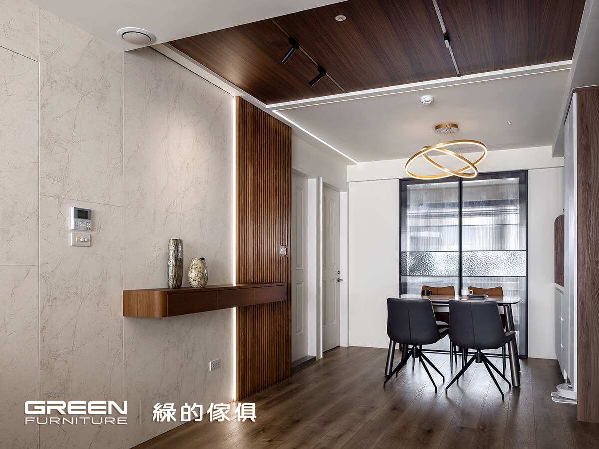 設計師串聯空間佈局,實現功能與美學的統一,使用開放式規劃消彌客餐廳邊界,將陽光自然地引進灑落。為了將電視牆視覺效果延伸,捨棄原有的房門採用木格柵造型門,放大公領域之於更突顯層次感;餐廳沿用客廳的現代風及線條元素,緊鄰溫潤的波爾櫻木紋餐櫃搭配白色烤漆門片,點綴著金色五金,一深一淺及異材質的搭配更顯整體視覺的和諧,放眼所及處處透漏細膩與質感。