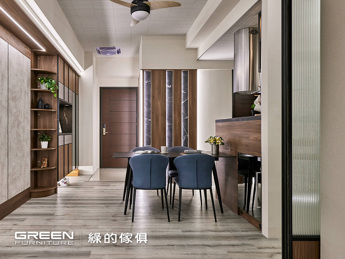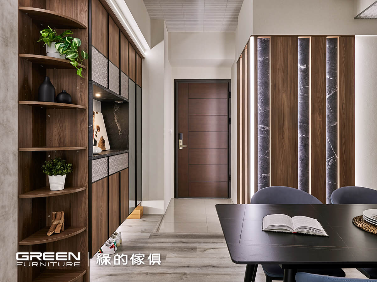 進門左側以日式格柵窗為設計靈感,波爾櫻木紋與黑雲岩石紋交錯搭配,營造出簡約高雅的玄關氛圍。格柵中嵌入邊條燈帶,不僅解決了無主燈的照明問題,也增添玄關的層次與設計感。右側鞋櫃採用系統櫃懸空設計,有效減輕視覺負擔,下方空間方便擺放拖鞋或剛進門的鞋子透氣收納,既美觀又實用。