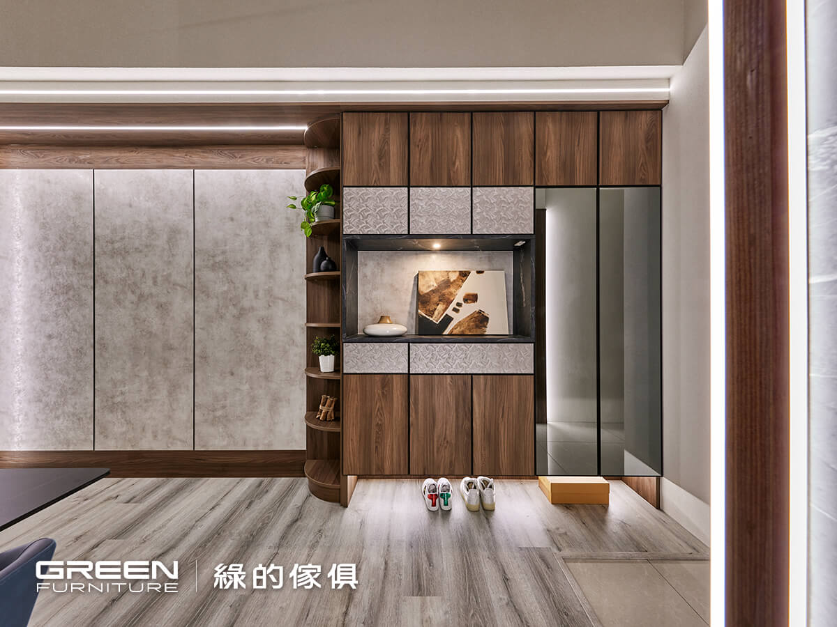 鞋櫃側邊設置穿衣鏡,方便出門前整理儀容,同時達到放大空間的視覺效果。整體玄關櫃體皆採用高質感的系統傢俱設計,延續波爾櫻木紋板材搭配咖啡鋁框五金與澤葉銀的特殊紋理,一路延伸至客廳主牆。