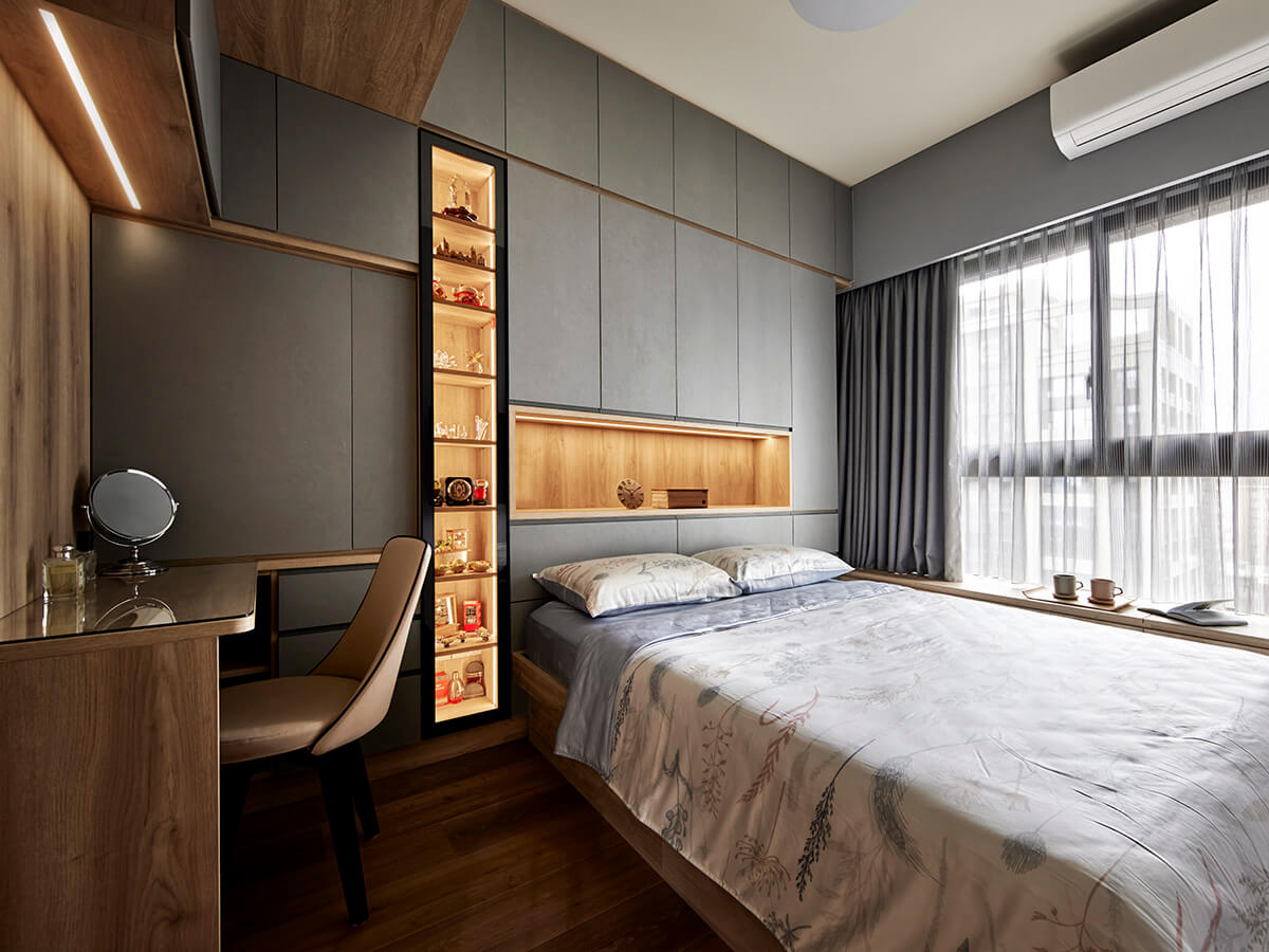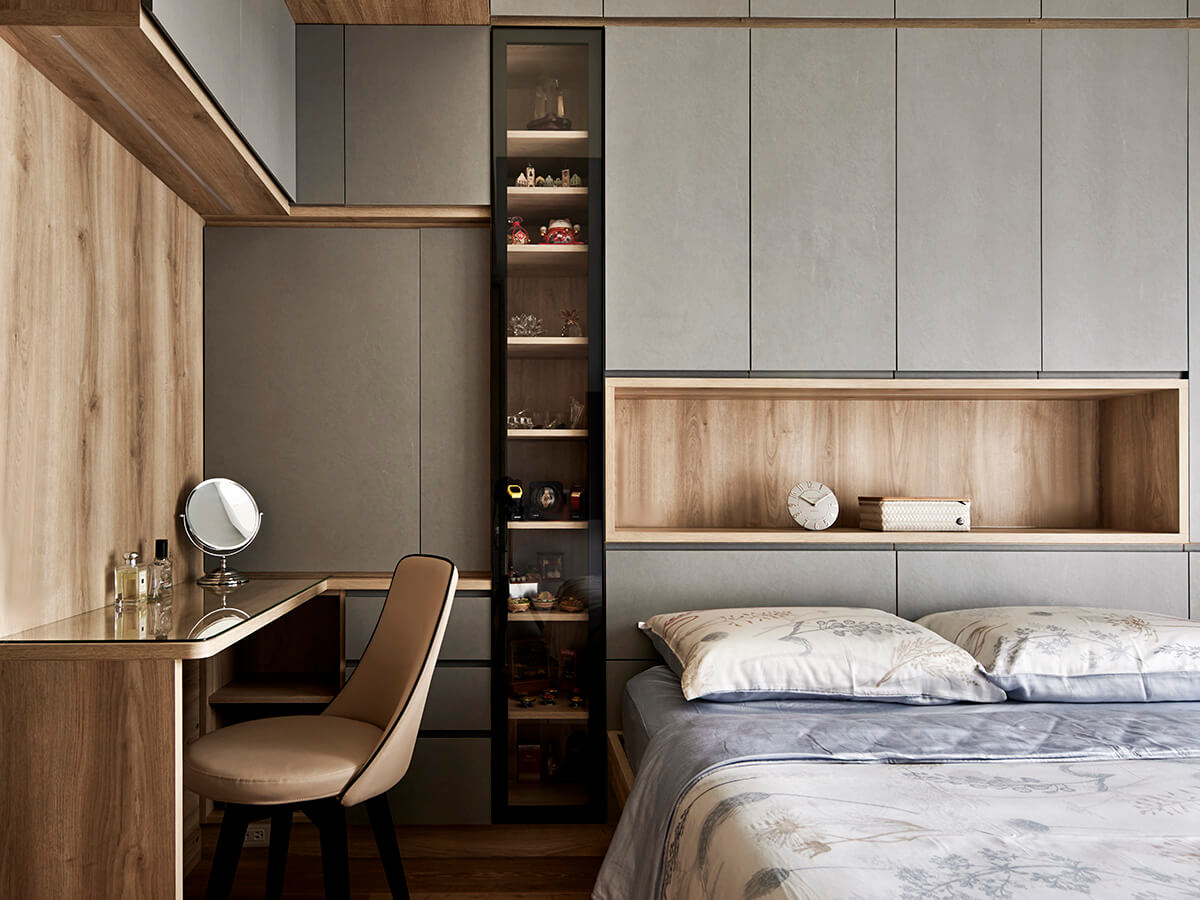 緊鄰床架的側邊櫃是旅遊各國的收藏,不論是泰國小吃攤模型縮影,或是療癒心靈的水晶擺飾,生動活潑的各種物件,讓整室頓時又熱鬧起來。櫥櫃適時的簍空,讓空間的層次更為明顯;灰色系裝潢正在這靜謐的空間裡透露著鮮活的生命力。