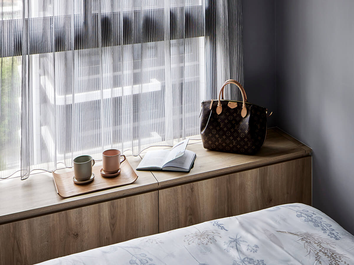 沿著窗邊而立的臥榻捎來禪意,隨著陽光灑落,讓人想擁抱一室的溫暖;趁著春意正濃,恣意享受這清逸悠閒的時光,格外寧靜寫意。臥榻下方的上掀式櫥櫃,提供額外的收納空間。友人來訪時,臥榻也搖身一變成了座位區。