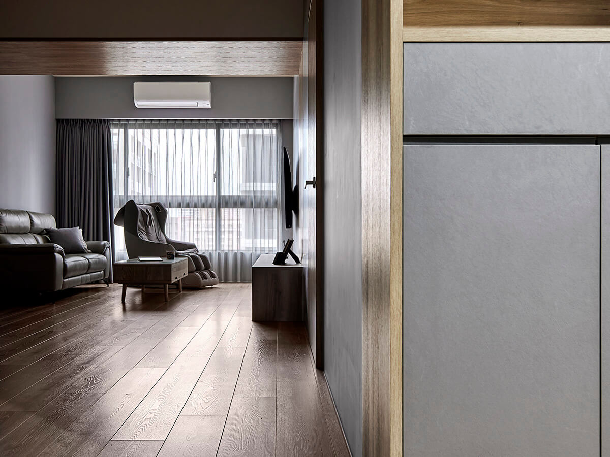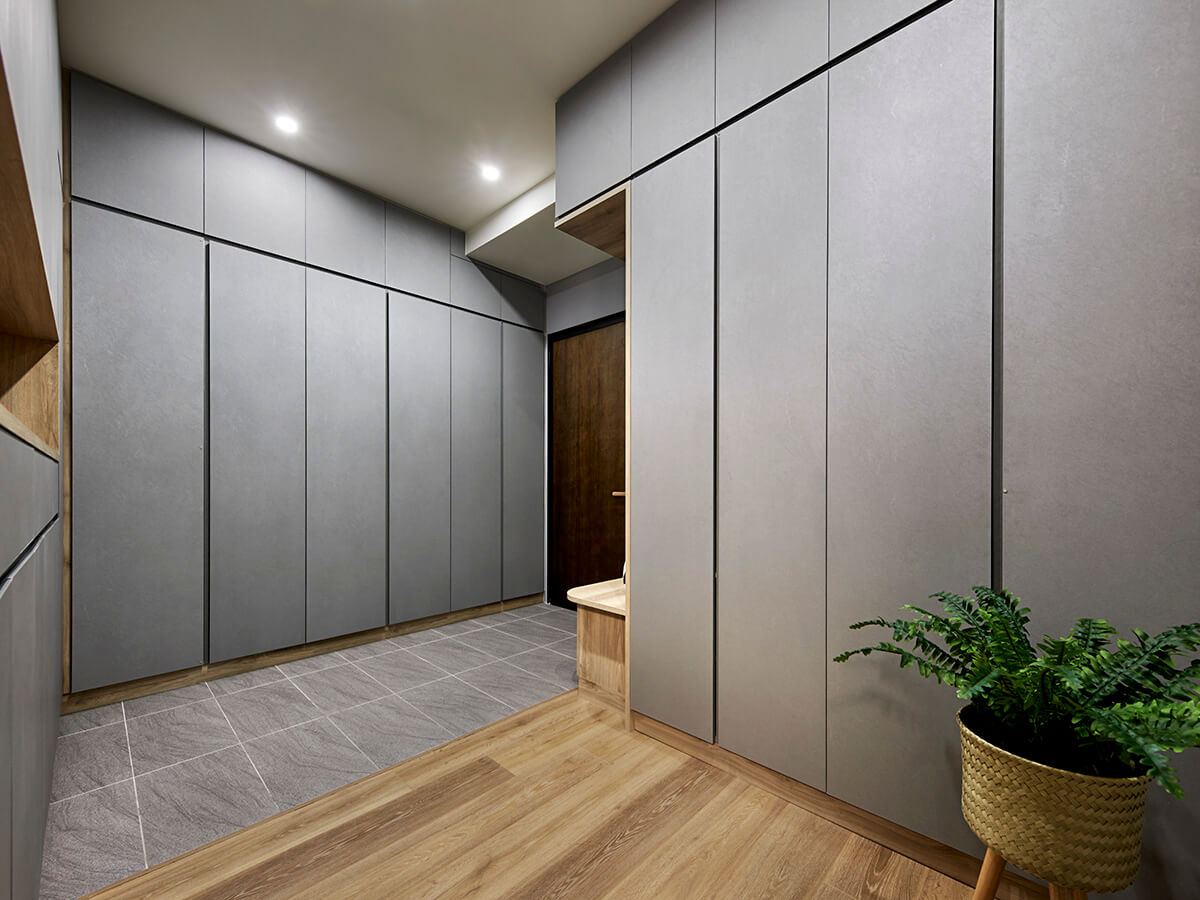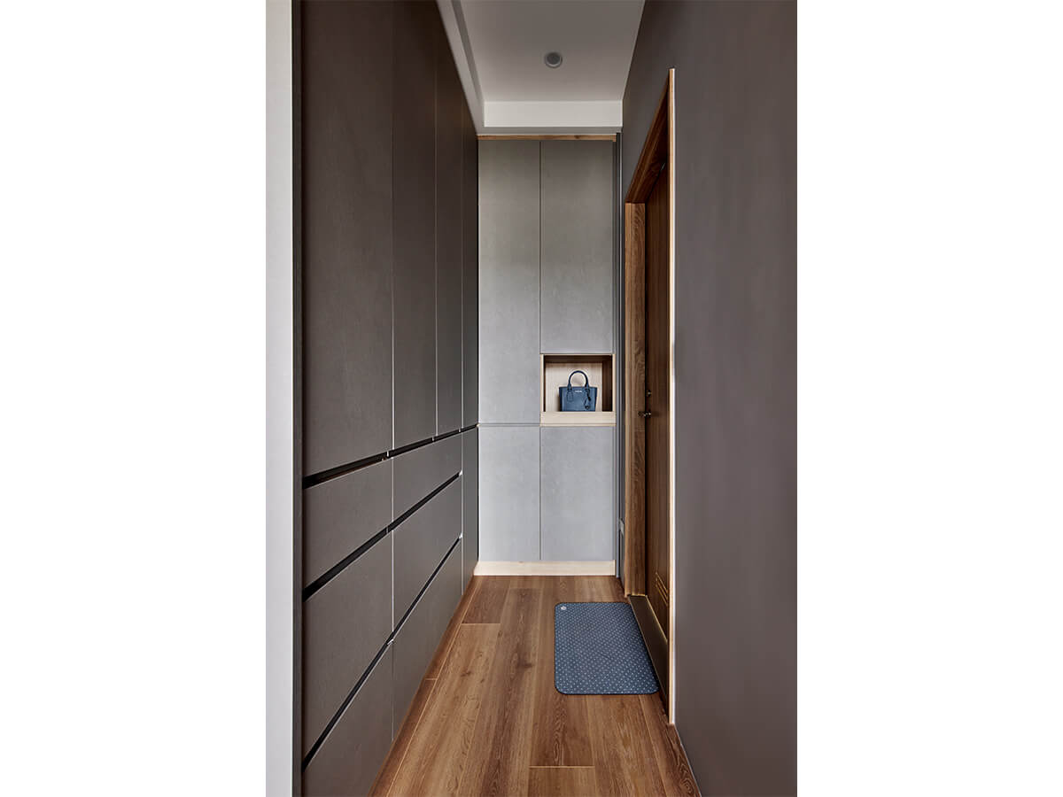 細節也藏著貼心巧思,像是斜背的牆面就用鋁件收邊,不只讓整體視覺更俐落,也保護日常使用的耐久度。整個玄關空間沒有多餘裝飾,卻讓人感受到設計的溫度和用心,剛剛好的灰與木,替每一次回家鋪陳出柔和的儀式感。