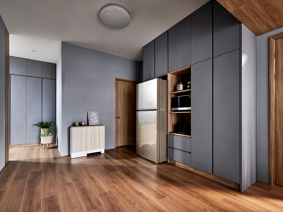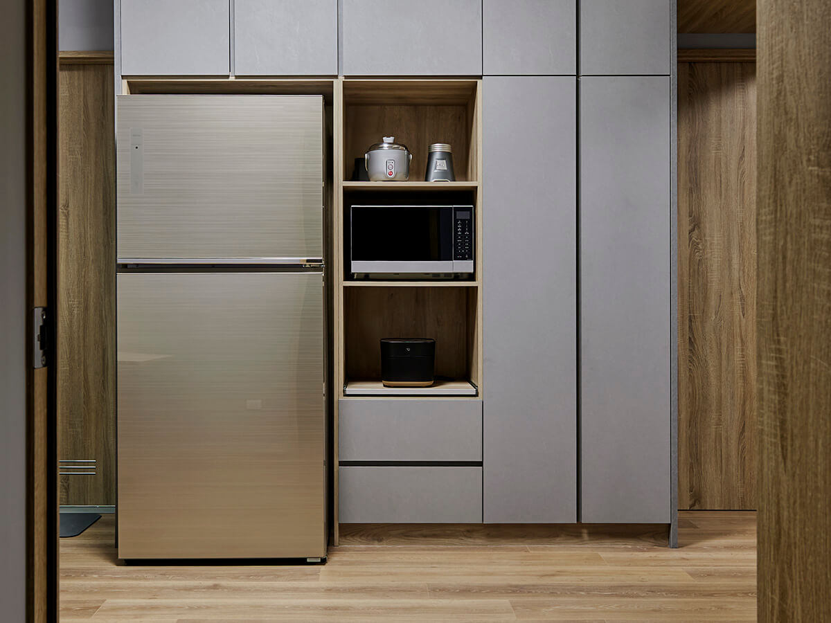 餐廳區的餐櫃也是滿版岩灰與奶橡,屋主鄭媽媽巧手收納的各種備品,井然有序各自在其專屬的角落就定位。緊鄰的電器櫃搭配托盤式滑櫃,方便小家電的輕鬆收納與取用。