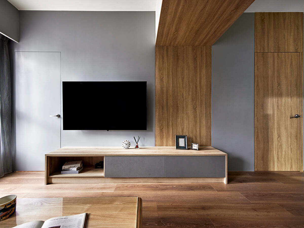 電視牆不意外也是以灰階做為主要顏色,灰牆與木門各自與情境融為一體。威尼斯全牛皮沙發也在另一側倚牆而立,灰色系裝潢的異材質搭配在此發揮得淋漓盡致。