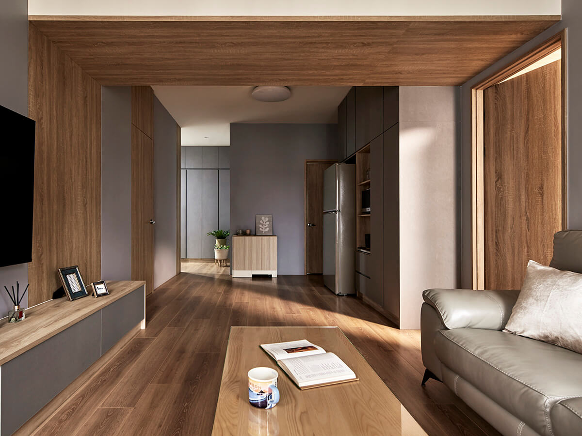 客廳整體設計的切分與原建築的樑柱完全貼合,搭配各空間隱藏門的設計,線條簡單又俐落。