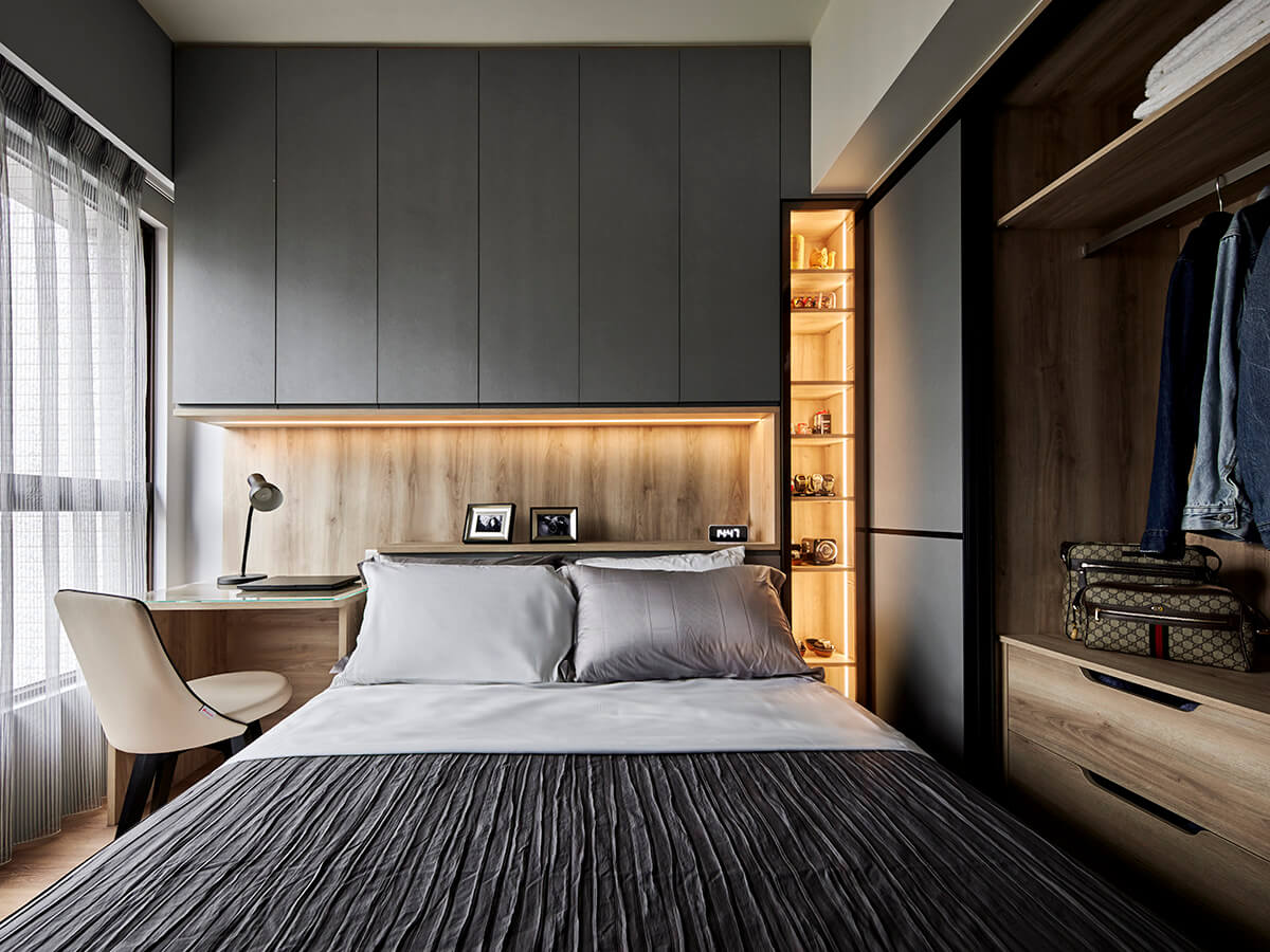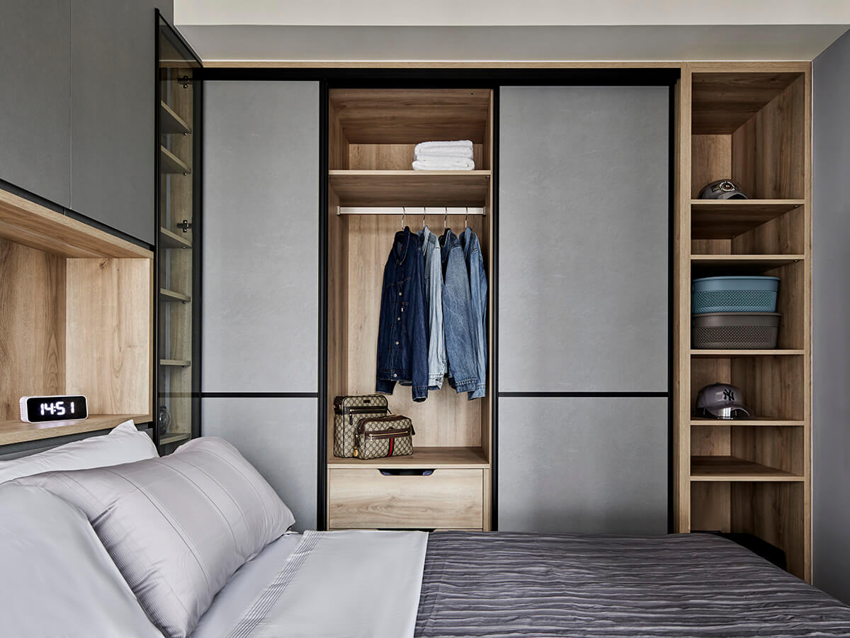 開放與封閉式櫃體穿插設計,搭配頂天立地的整面櫃牆,垂直空間也被充分利用。書桌與衣櫃合併規劃,推拉門減少打開所需的空間幅度,動線簡潔順暢,展現日式收納哲學的實踐精神。