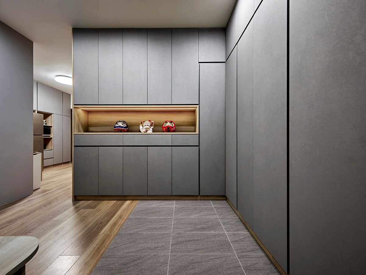 系統櫃設計一路沿著牆面延伸,頂天立地,包含鞋櫃、儲物櫃,甚至連汙衣區也事先安排好,收納機能一應俱全。上方還特別留了一區開放展示櫃,屋主擺上日式小物與開運擺飾,既是生活的注腳,也是最療癒的端景。
