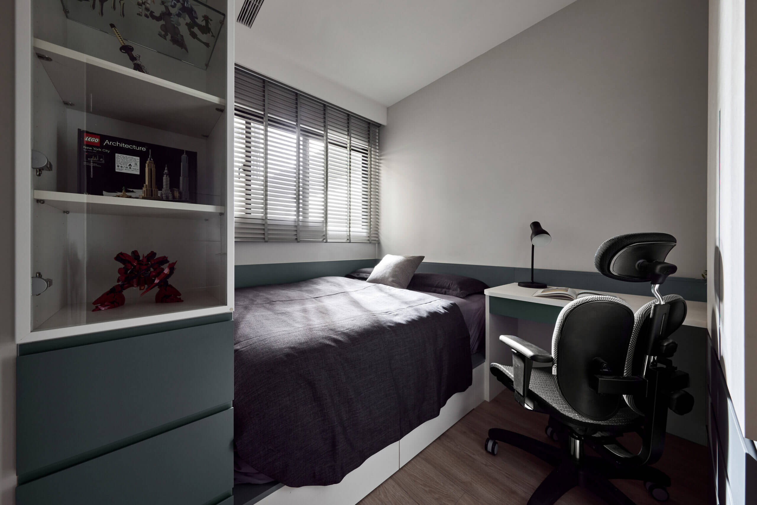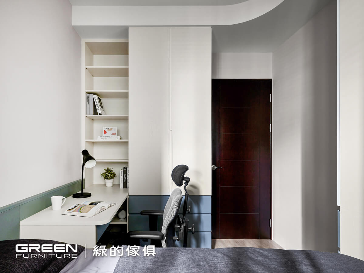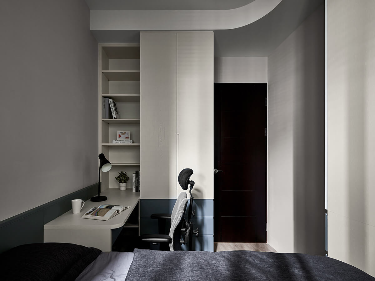 喜歡深藍色的兒子,衣櫃以鑼帛無把手櫃門與灰藍色抽屜搭配而成,緊鄰床尾的同款設計櫥櫃以鑼帛與灰藍色交織搭配而成。藍色系的佈置搭配鑼帛,沿著貼壁櫥櫃延伸出來的書桌,也依著櫥櫃的板材與色調統一規劃。入門的玻璃櫃裡的收藏品則以清玻隔絕,下方以灰藍色抽屜櫃襯托。