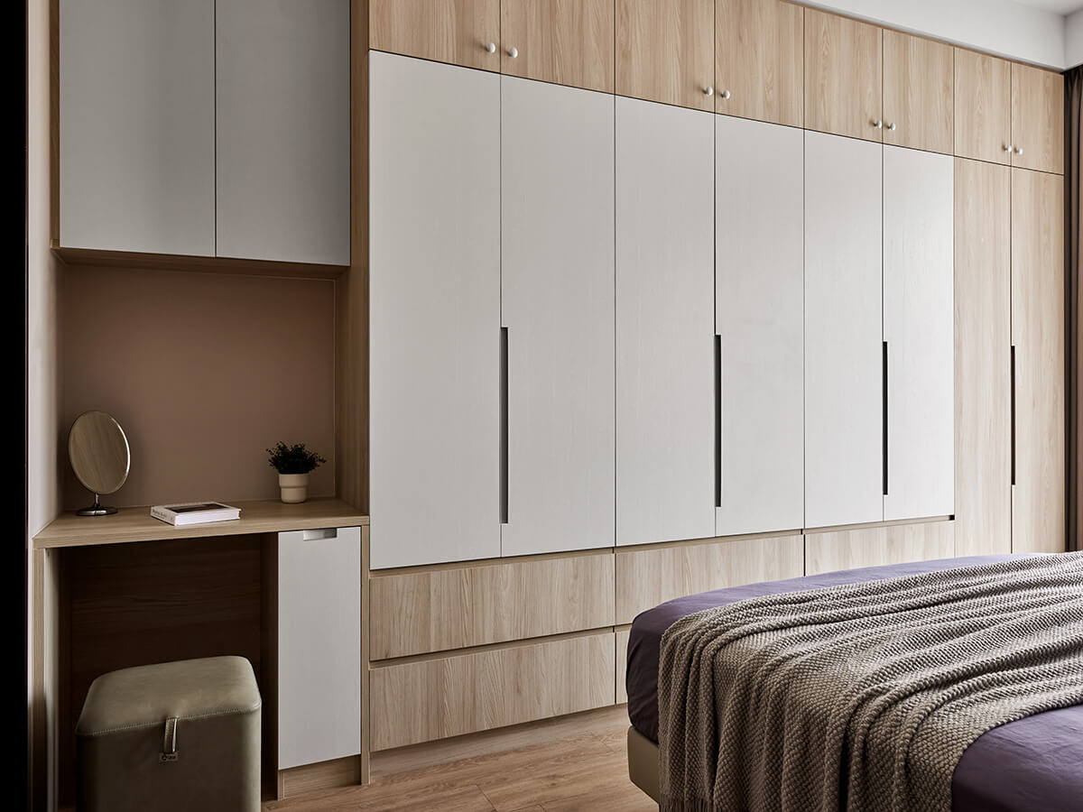 收納空間依需求盡情放大,黑五金手把框搭配亞麻色的門片將所有櫃體的主題定調,色彩協調簡單,線條乾淨俐落。