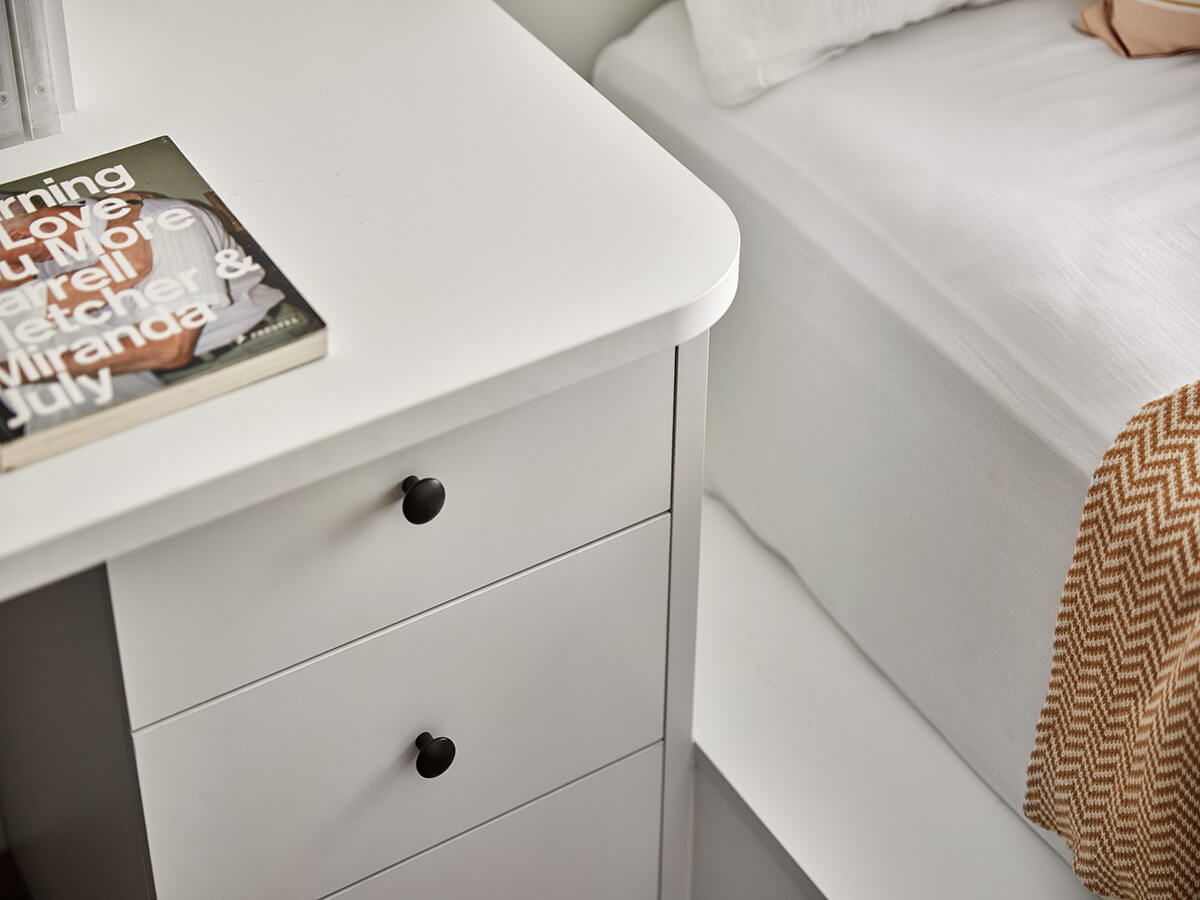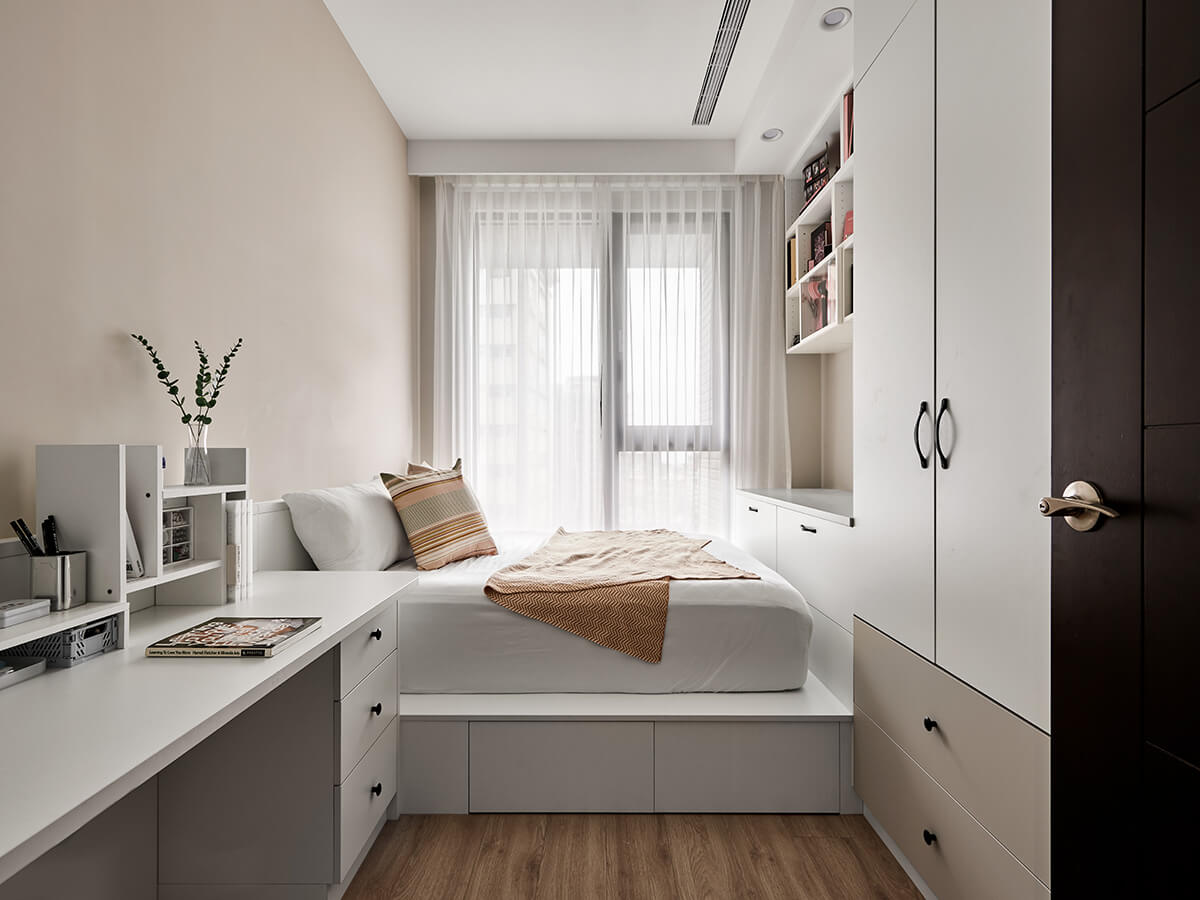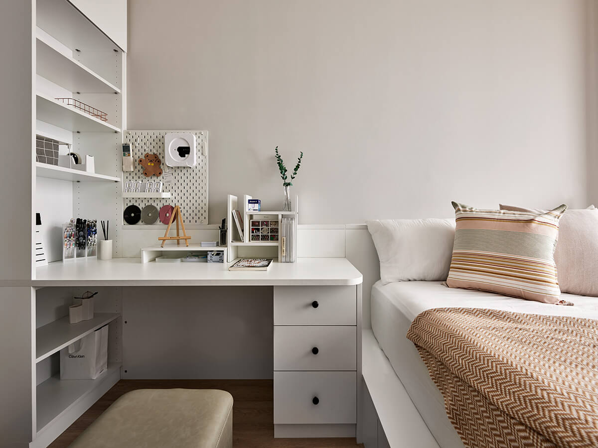 女兒鍾愛白色系,房裡純白潔淨的空間,滿足每個女孩心中的夢想。衣櫃以白色為基底,襯以些許冰灰,復古雕花的把手更為這櫥櫃增添些許夢幻。與床板緊鄰的書桌以弧形拉開造型,一字型的櫥櫃連結書桌,依舊是一襲白色。量身定做的床架下方為按壓式抽屜,床架、床頭與抽屜櫃,也以滿版鑼帛鋪墊。