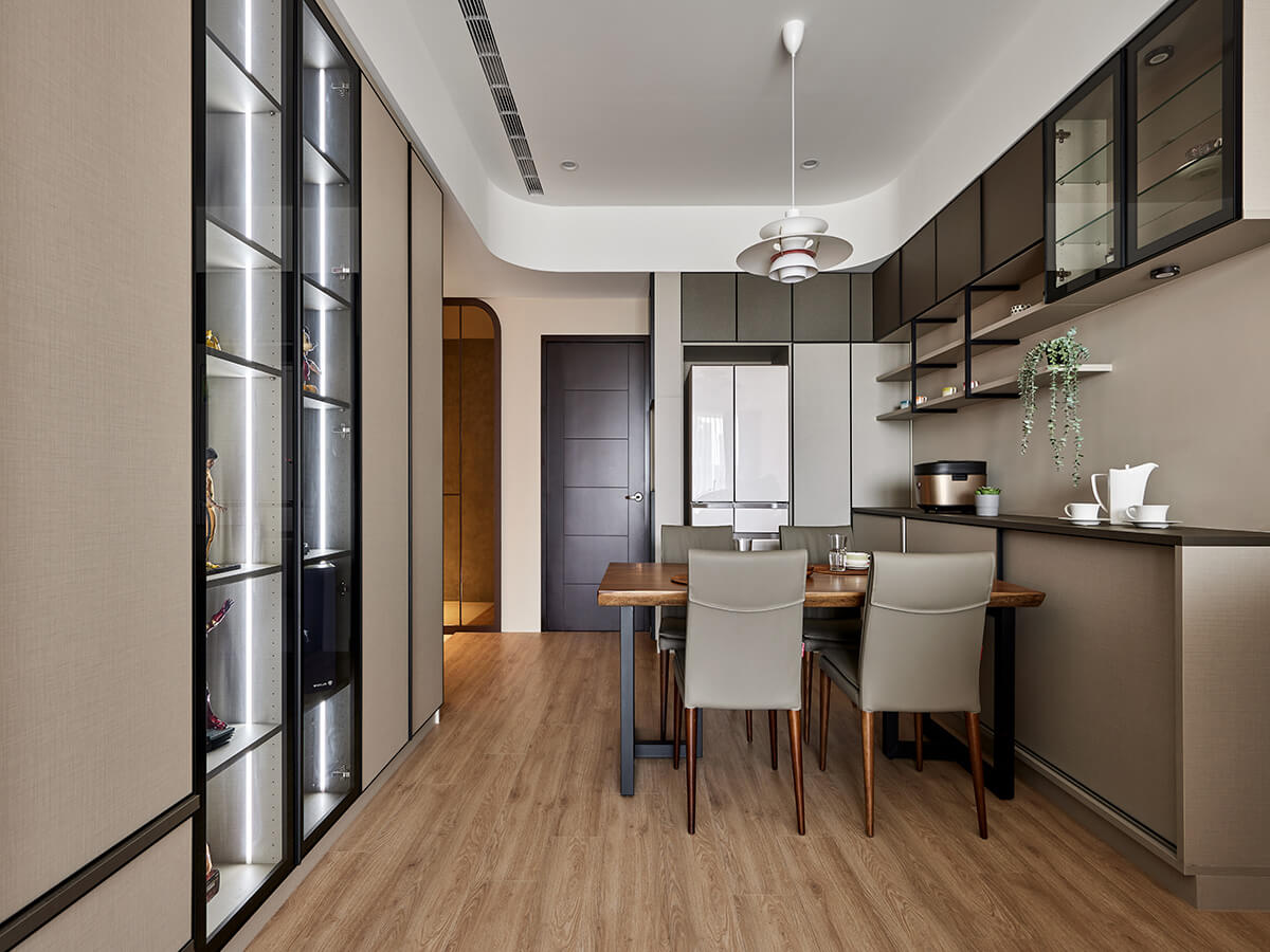 靠牆面半開放式的懸吊櫃,是餐廳設計的重點之一,門板以亞麻灰搭建,並以黑五金手把框修飾,半開放的櫥櫃空間顯得很多元,與擺放的精緻餐具自然形成一道風景線,適度的燈條增添室內氣氛,輔以白色吊燈的襯托,就是最美好的端景。