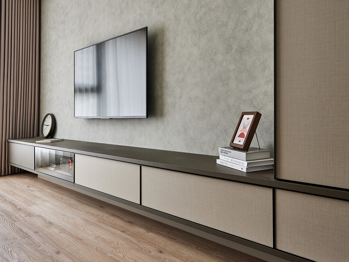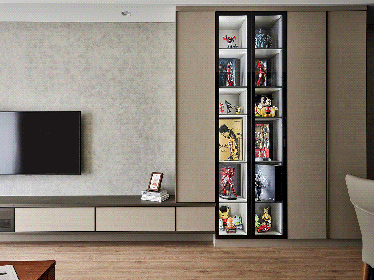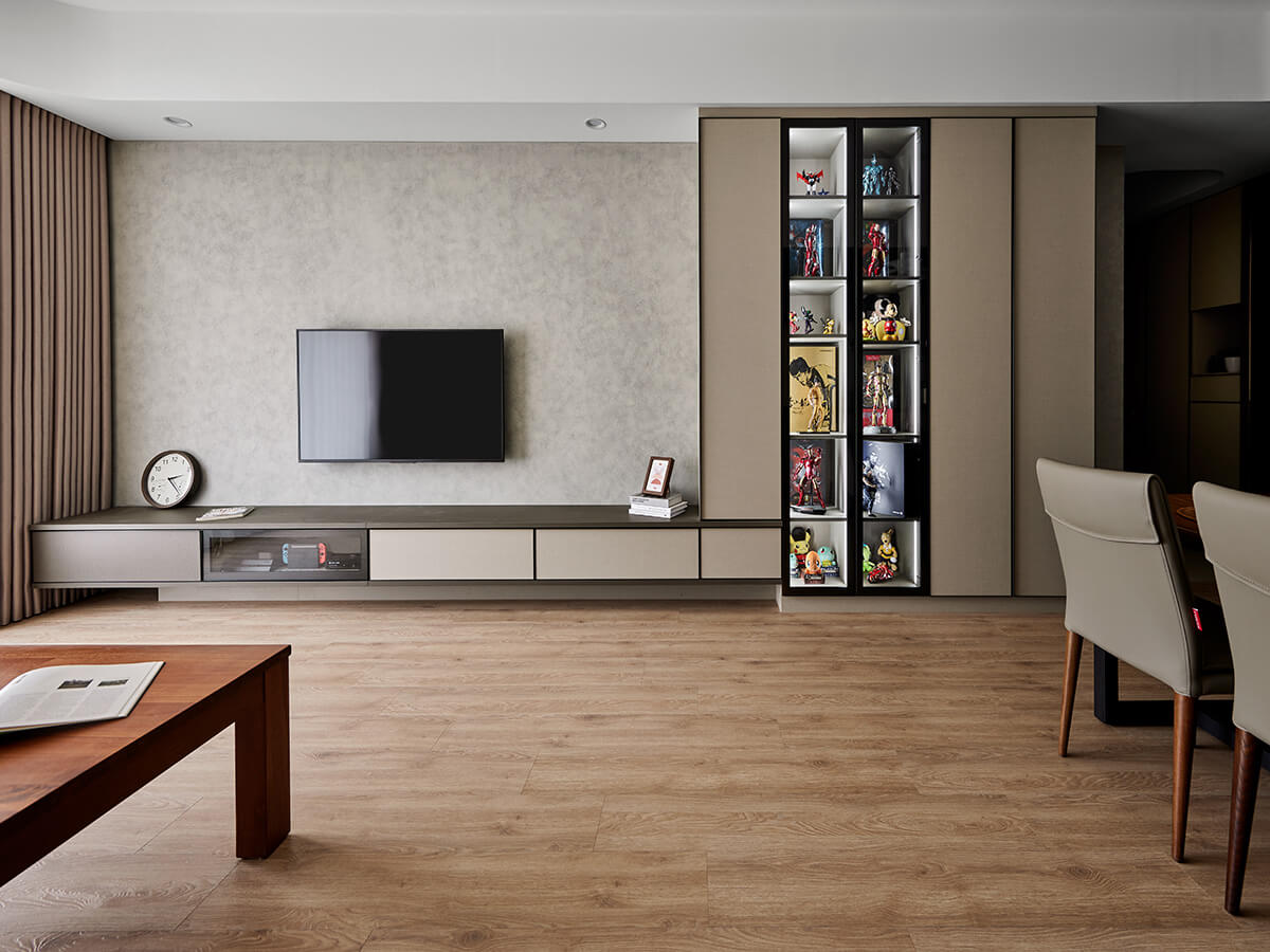 電視牆側邊櫃分別是屋主收藏品的家與隱藏式書櫃,以穩重的亞麻灰為主。電視櫃檯面以鈦絲褐為鋪墊,檯面下方的儲藏櫃則以黑五金手把框搭配鈦絲褐門片收尾,線條簡潔有力。